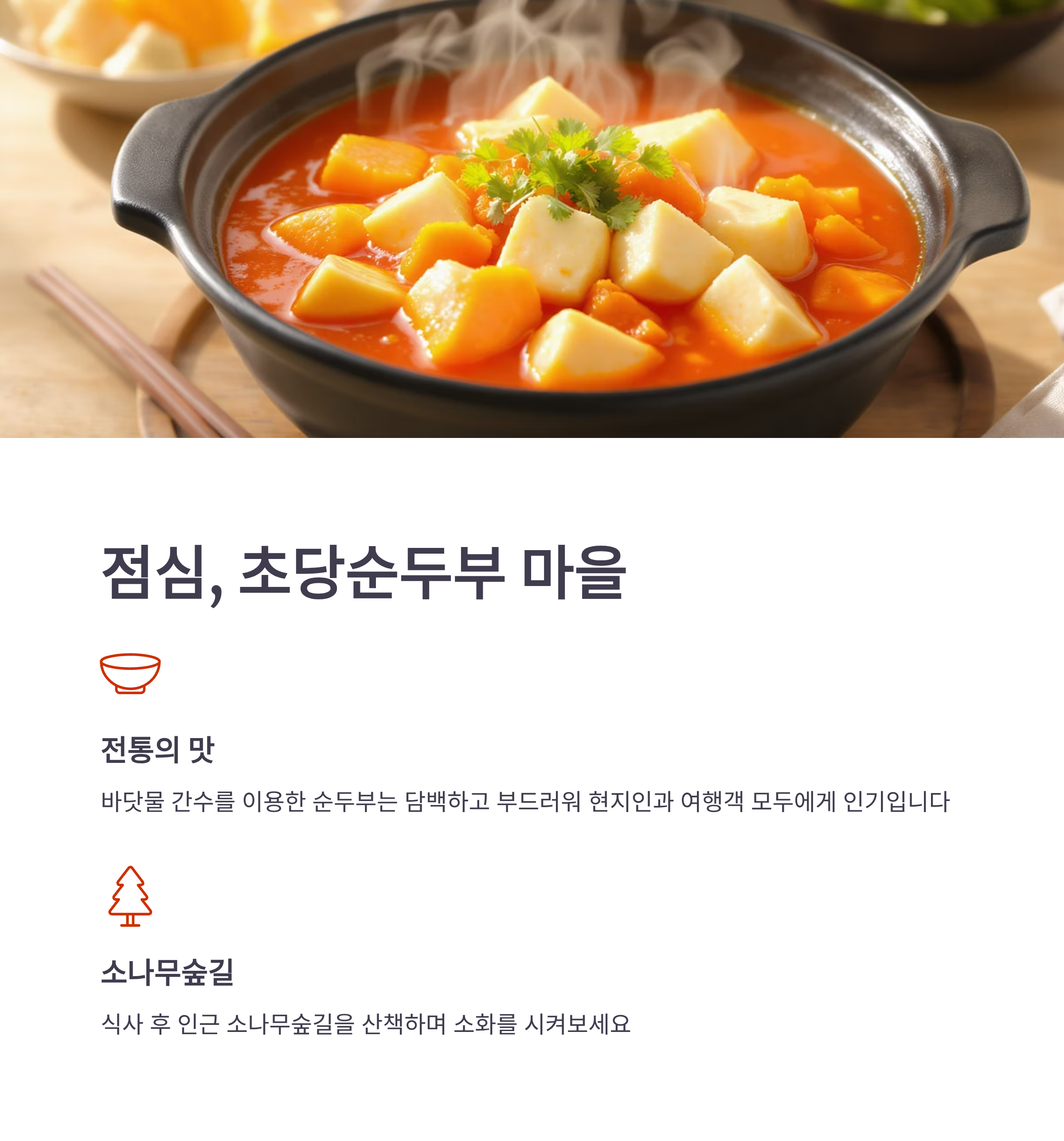 강릉 여행에서 빠질 수 없는 코스가 바로 초당순두부 거리입니다. 바닷물 간수를 이용한 순두부는 담백하고 부드러워 현지인과 여행객 모두에게 인기입니다. 식사 후에는 인근 소나무숲길을 산책하며 소화를 시켜보세요.