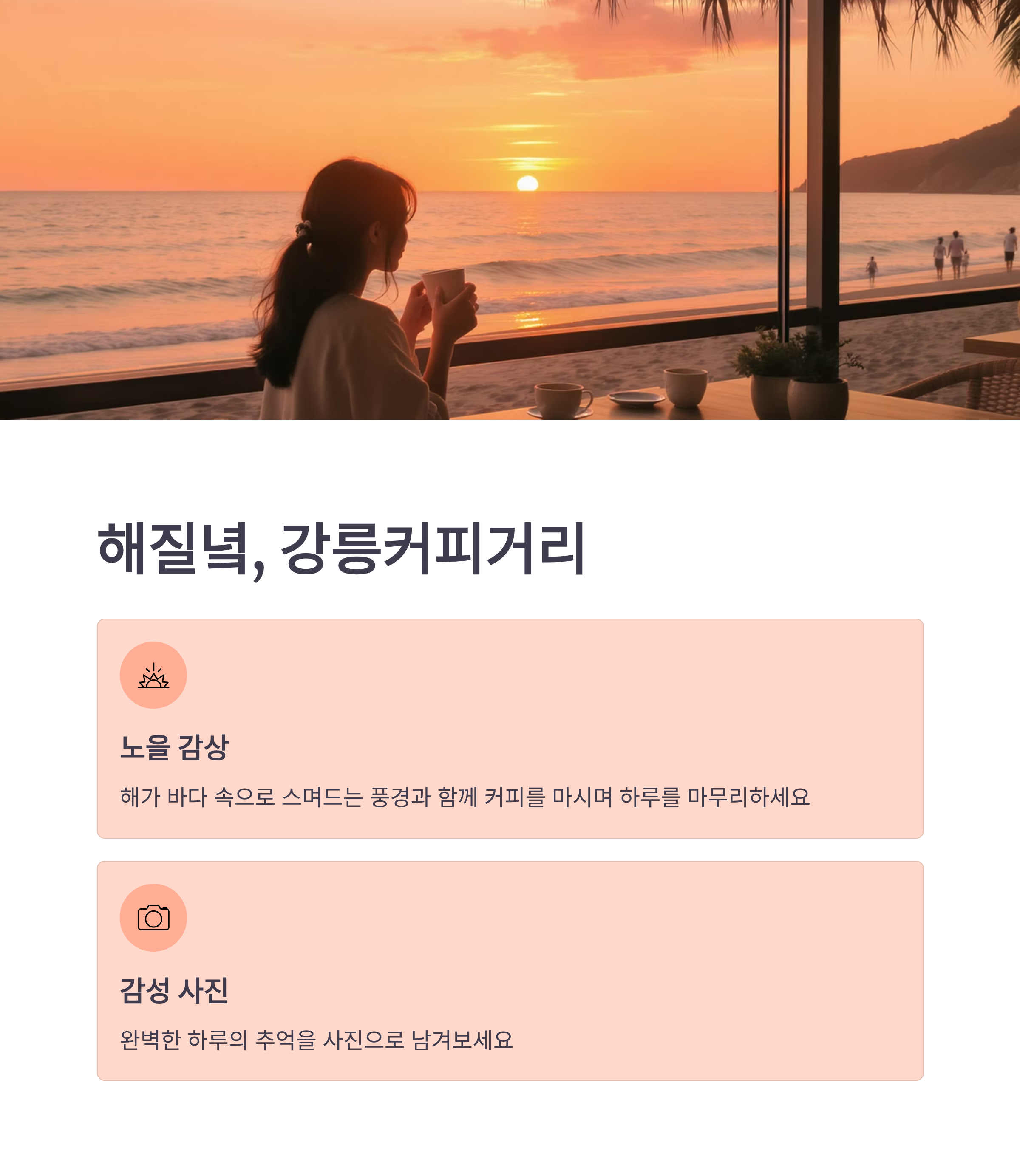 해 질 무렵 다시 안목해변으로 돌아와 저녁 노을을 바라보며 커피를 마시면 완벽한 하루가 완성됩니다. 해가 바다 속으로 스며드는 풍경과 함께 감성 가득한 사진도 남길 수 있습니다.
