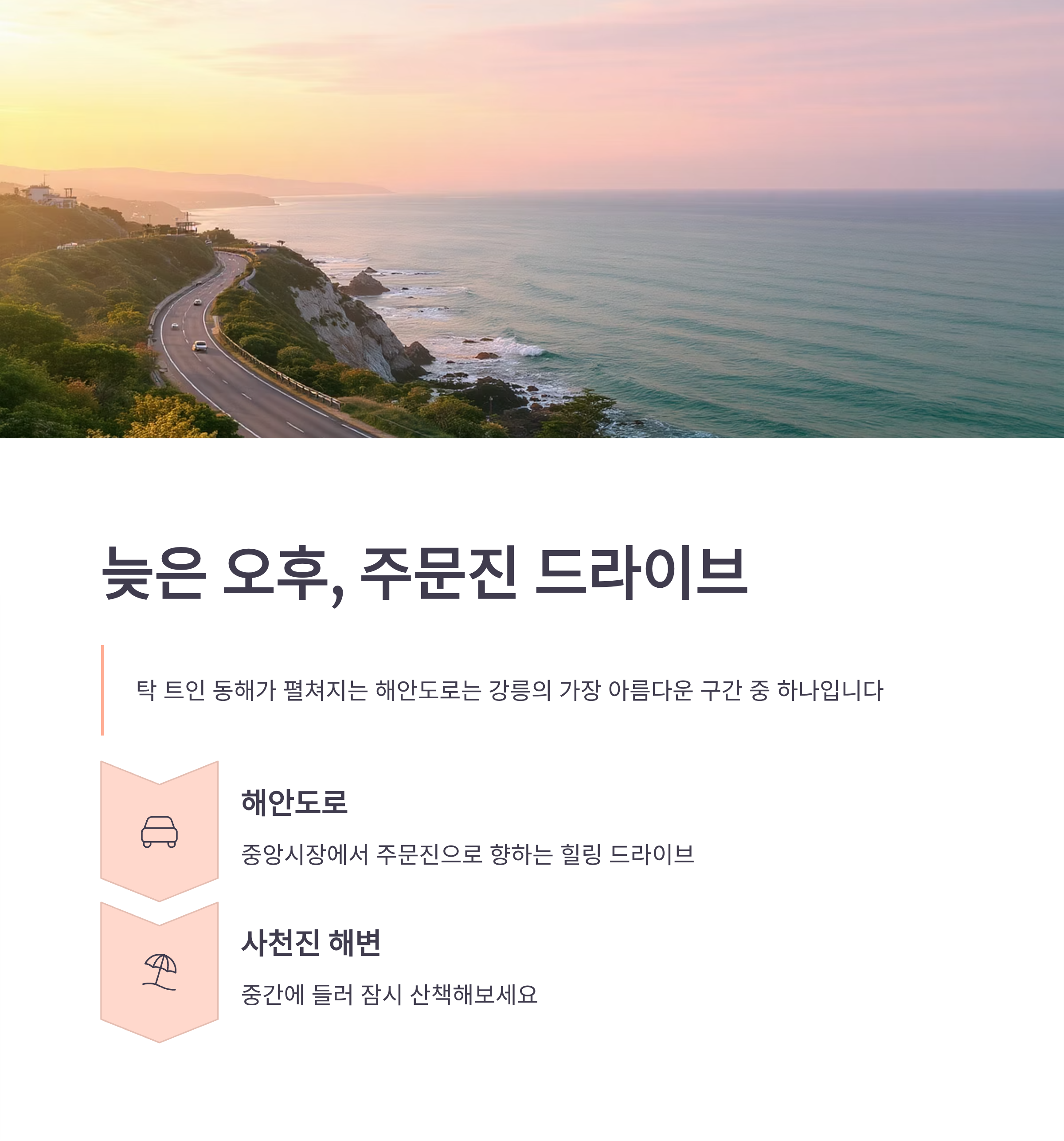중앙시장에서 주문진으로 향하는 해안도로는 강릉의 가장 아름다운 구간 중 하나입니다. 탁 트인 동해가 펼쳐지는 이 드라이브 코스는 그 자체로 힐링입니다. 중간에 ‘사천진 해변’이나 ‘주문진 방파제’를 들러 잠시 산책해보세요.