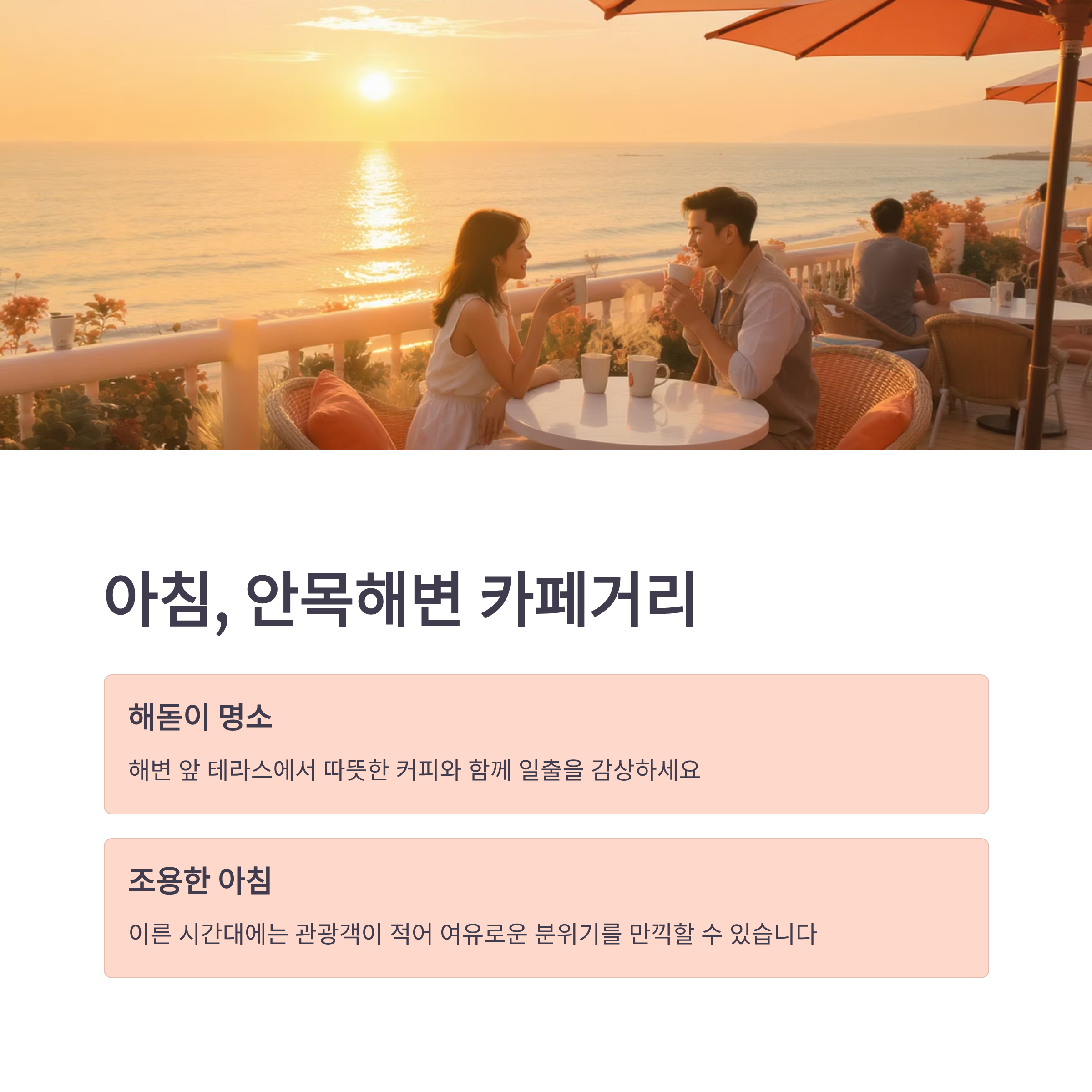 하루를 여유롭게 열고 싶다면 안목해변이 제격입니다. 카페거리로 유명한 이곳은 해돋이 명소로도 유명하며, 해변 앞 테라스에 앉아 따뜻한 커피를 마시며 일출을 감상하기 좋습니다. 이른 시간대에는 관광객이 적어 조용한 분위기를 만끽할 수 있습니다.