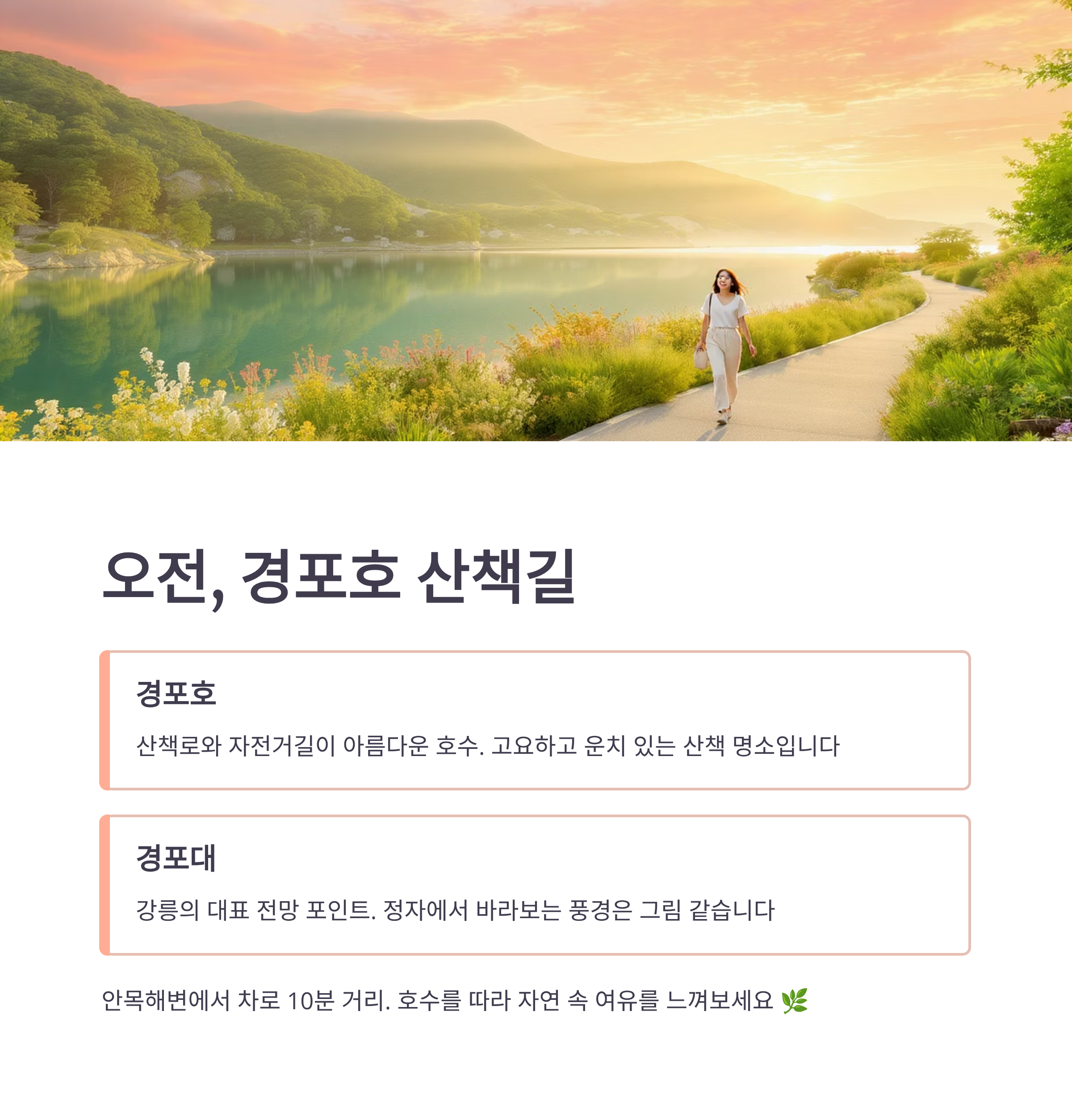 안목해변에서 차로 10분 거리에 있는 경포호는 고요하고 운치 있는 산책 명소입니다. 호수를 따라 조성된 산책로를 걸으며 자연 속의 여유를 느낄 수 있고, 경포대 정자에 올라 바라보는 풍경은 그야말로 그림 같습니다.