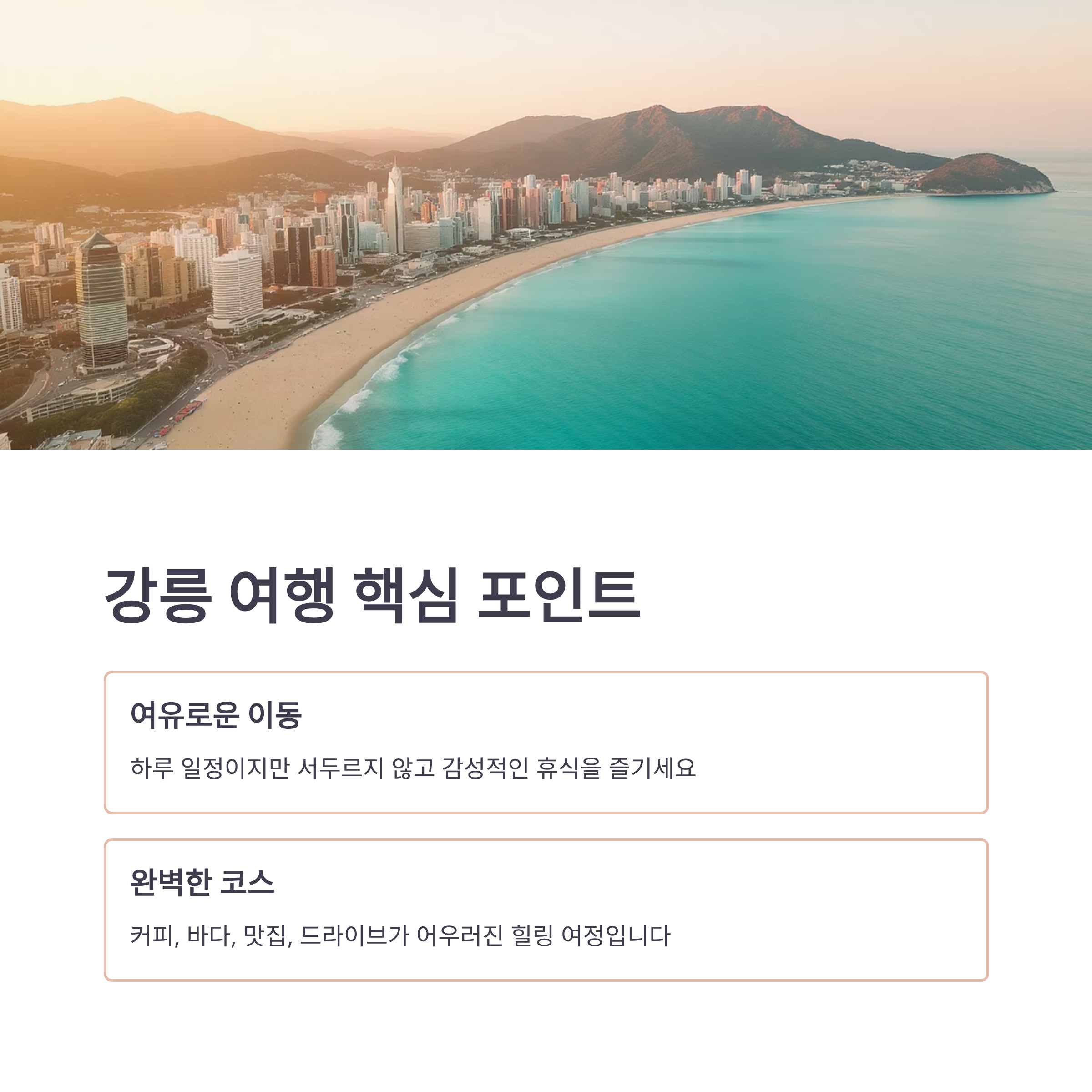 바다를 바라보며 커피 한 잔의 여유를 즐기고, 골목길을 거닐며 예쁜 카페와 갤러리를 찾는 여행. 강릉은 하루만으로도 충분히 감성을 채울 수 있는 도시입니다. 이번 글에서는 ‘하루 코스’로 강릉의 핵심 감성 명소를 연결한 힐링 루트를 소개합니다.