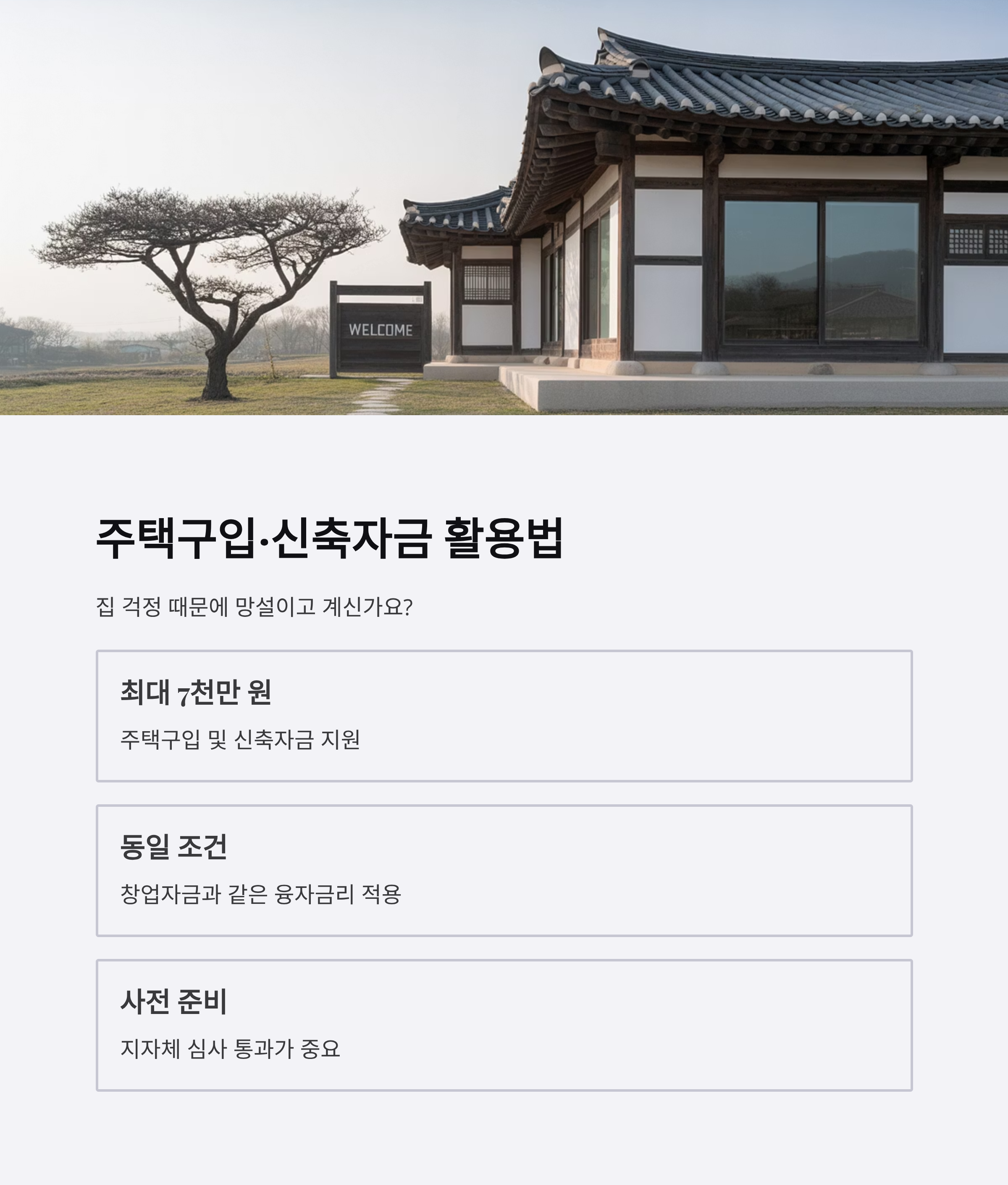 집 걱정 때문에 망설이고 계신가요? 귀농·귀촌을 위한 주택구입 및 신축자금 지원도 마련되어 있습니다.