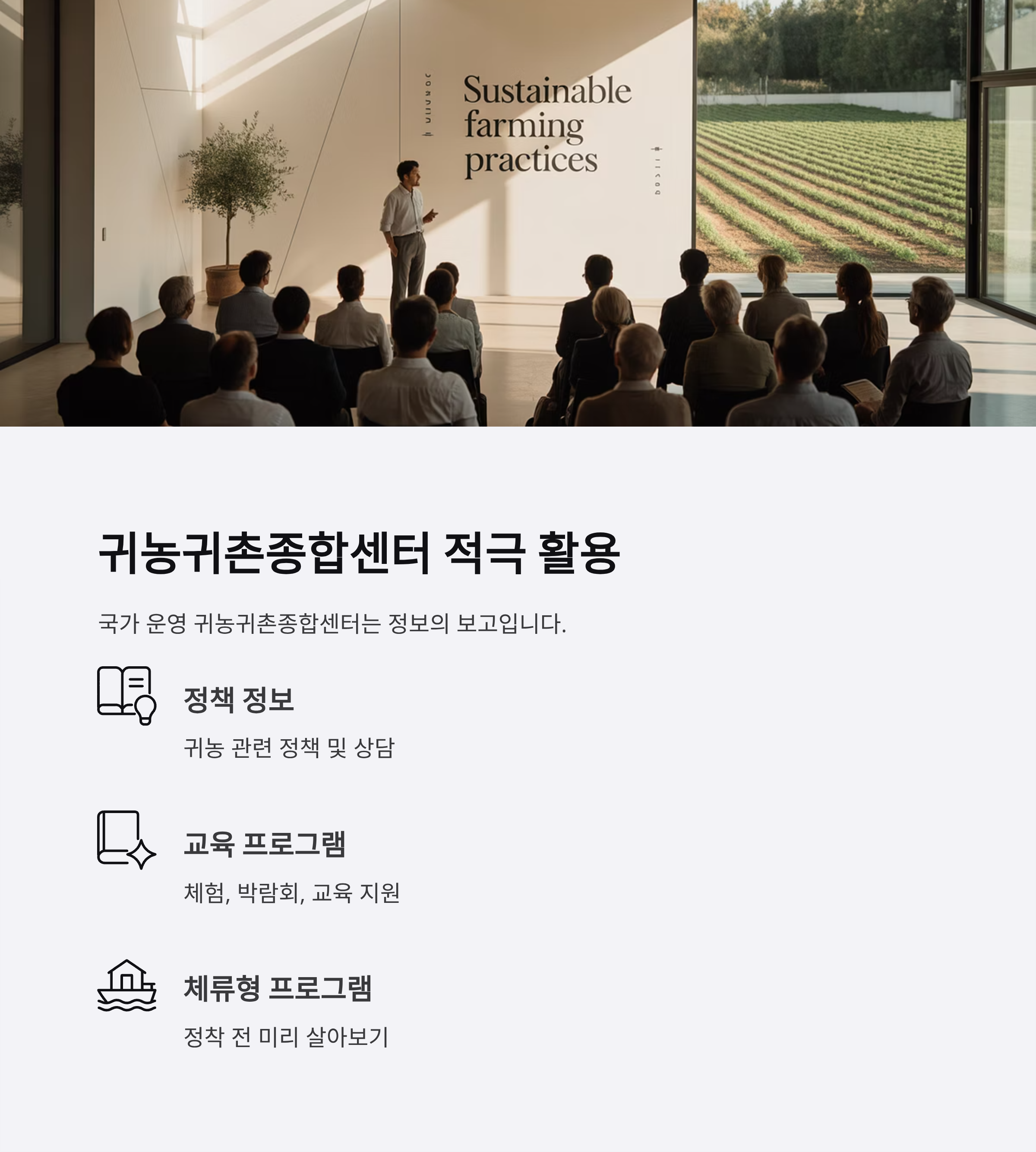여기서는 귀농 관련 정책뿐만 아니라 체험 프로그램, 상담, 박람회, 교육 등 실질적인 지원도 받을 수 있어요.