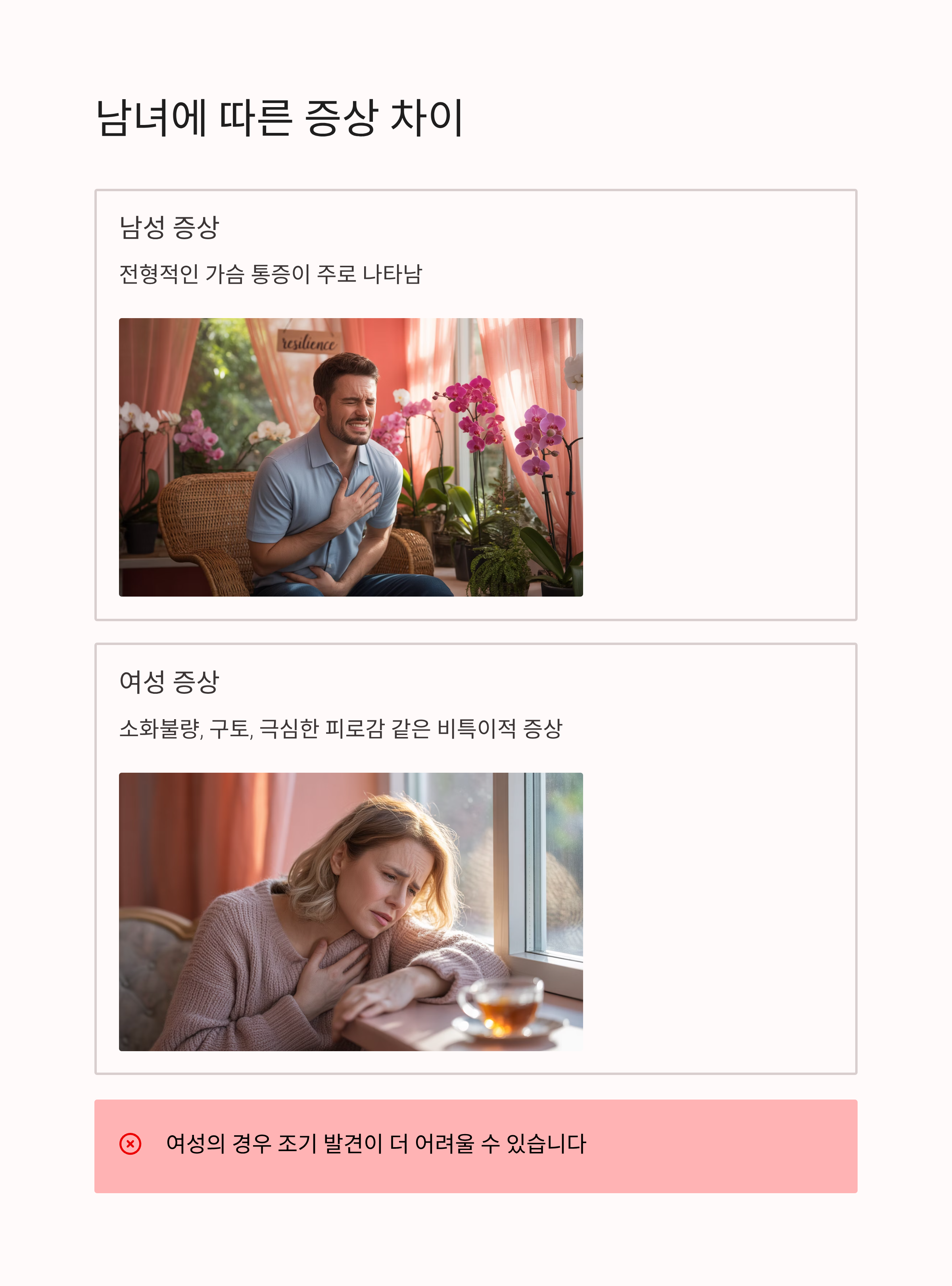 남성은 전형적인 가슴 통증이 주로 나타나는 반면, 여성은 소화불량, 구토, 극심한 피로감 같은 비특이적 증상이 먼저 올 수 있습니다. 이 때문에 여성의 경우 조기 발견이 더 어려울 수 있습니다.