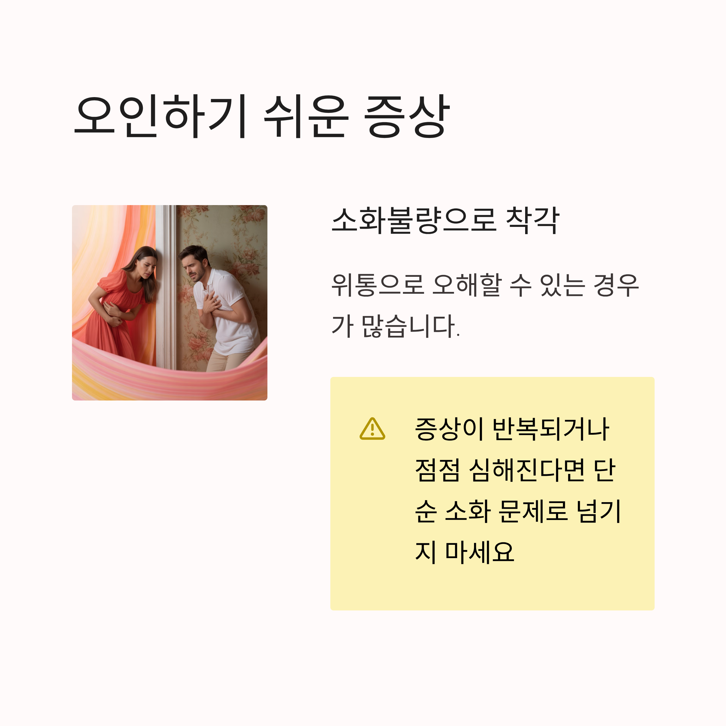 소화불량이나 위통으로 착각할 수 있는 경우가 많습니다. 하지만 증상이 반복되거나 점점 심해진다면 단순 소화 문제로 넘기지 말아야 합니다.