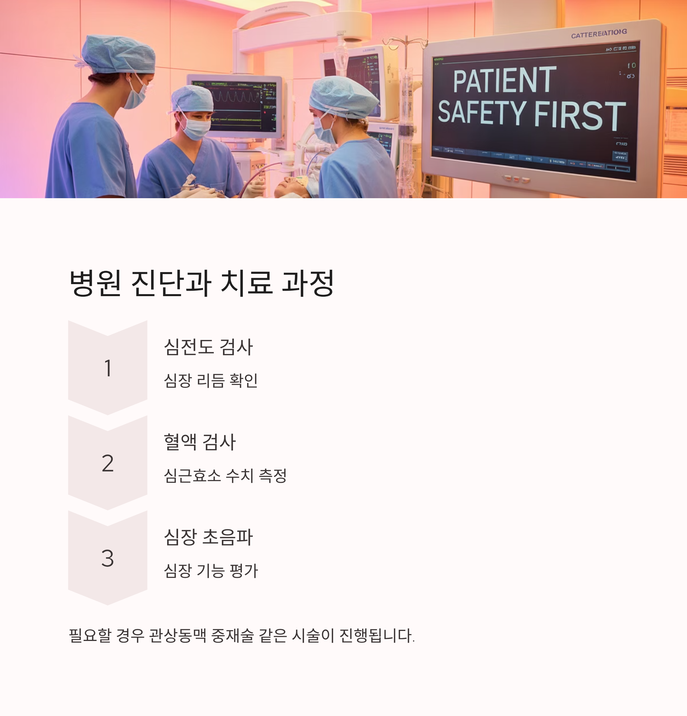 병원에서는 심전도 검사, 혈액 검사, 심장 초음파 등을 통해 진단을 내립니다. 필요할 경우 관상동맥 중재술 같은 시술이 진행됩니다.