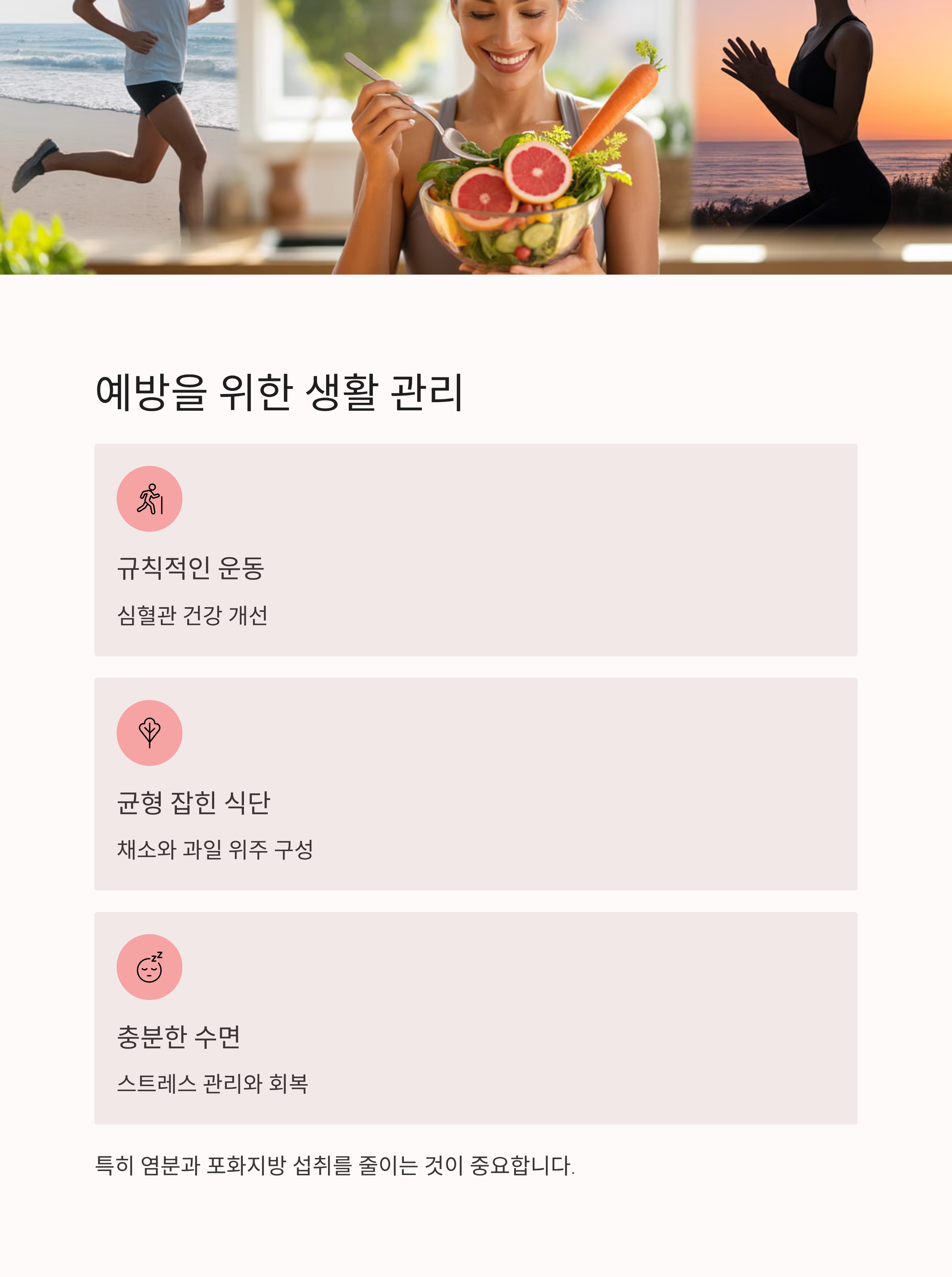 고혈압, 당뇨, 흡연, 고지혈증, 비만 등이 주요 위험 요인으로 꼽힙니다. 가족력이 있는 경우에도 발생 확률이 높아 주의가 필요합니다.