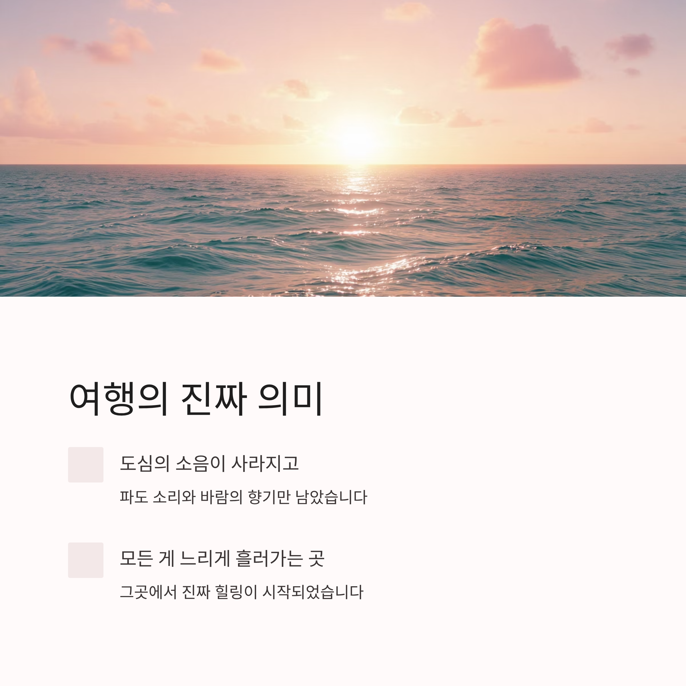도심의 소음이 사라지고, 대신 파도 소리와 바람의 향기만 남았습니다.