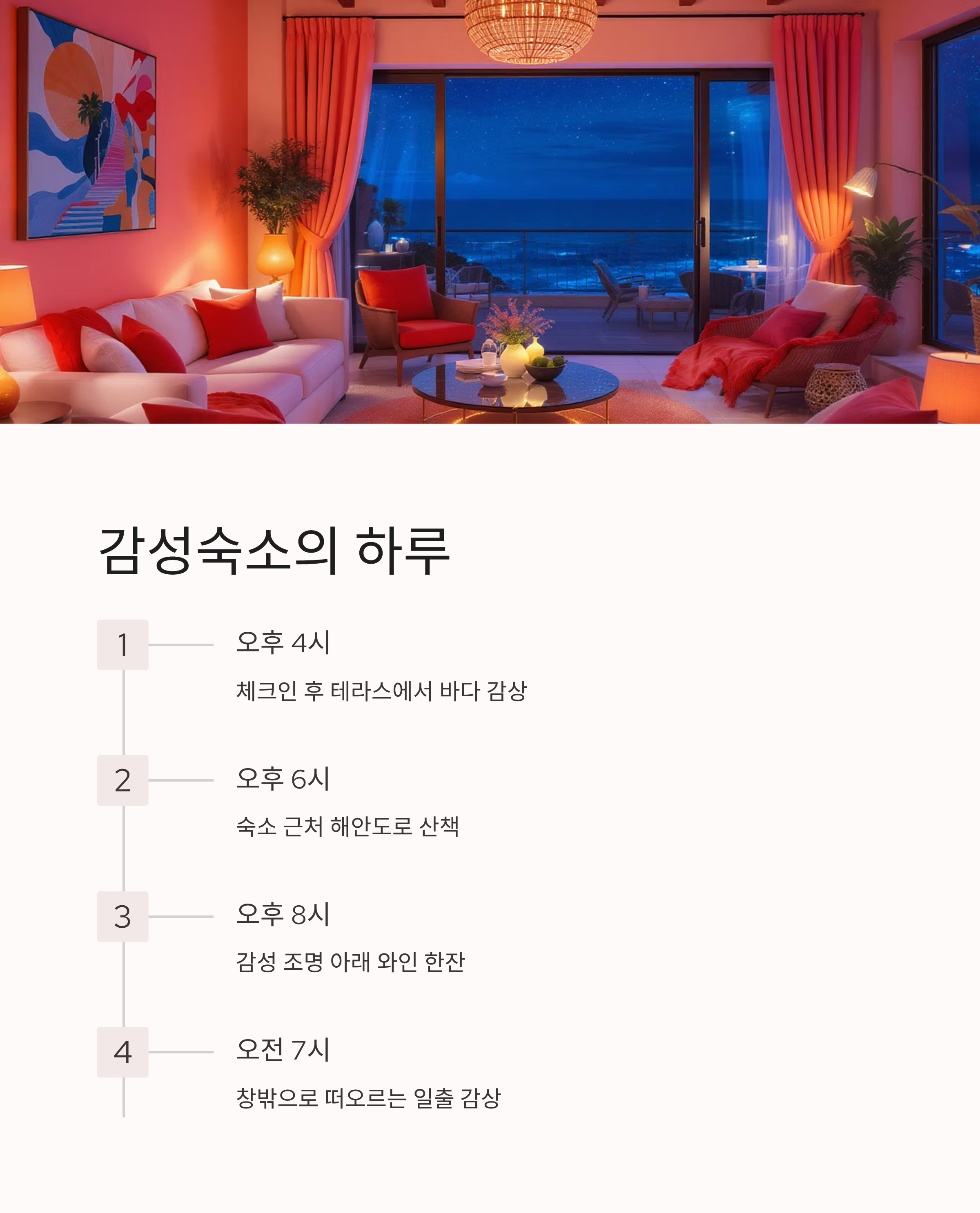 | 오후 4시 | 체크인 후 테라스에서 바다 감상 |