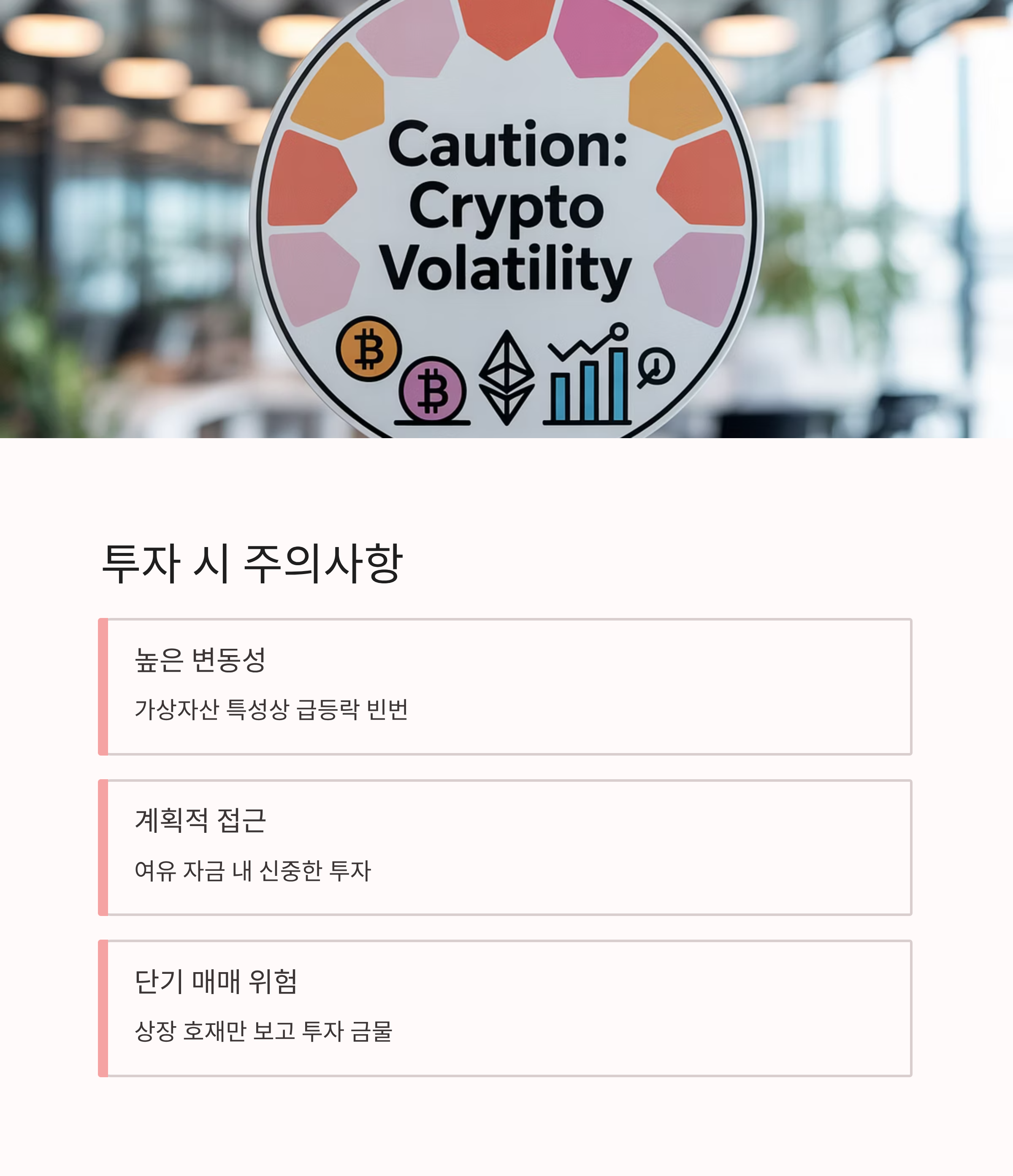 가상자산은 가격 변동성이 크기 때문에 무리한 투자보다는 여유 자금 내에서 계획적으로 접근하는 것이 중요합니다. 상장 호재만을 보고 단기 매매를 시도할 경우 손실 위험이 있습니다.