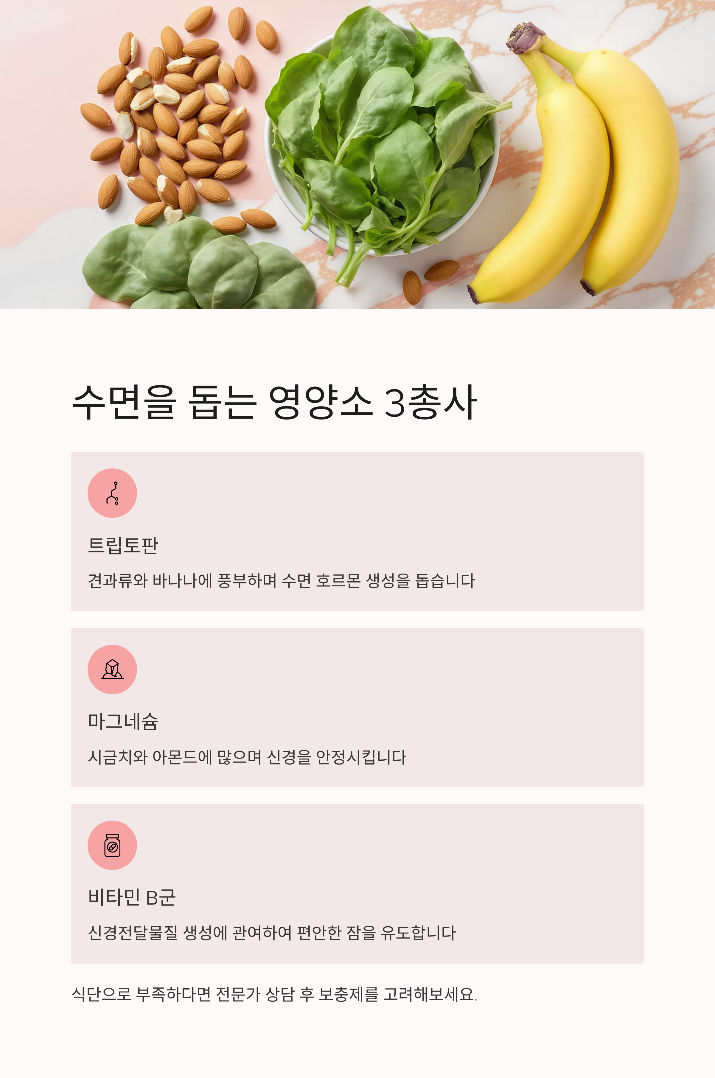 트립토판, 마그네슘, 비타민 B군은 신경 안정과 수면 호르몬 생성에 관여합니다. 트립토판은 견과류나 바나나, 마그네슘은 시금치나 아몬드에 풍부합니다. 식단으로 충분히 섭취하기 어려운 경우, 전문가 상담을 통해 보충제를 고려해볼 수 있습니다.