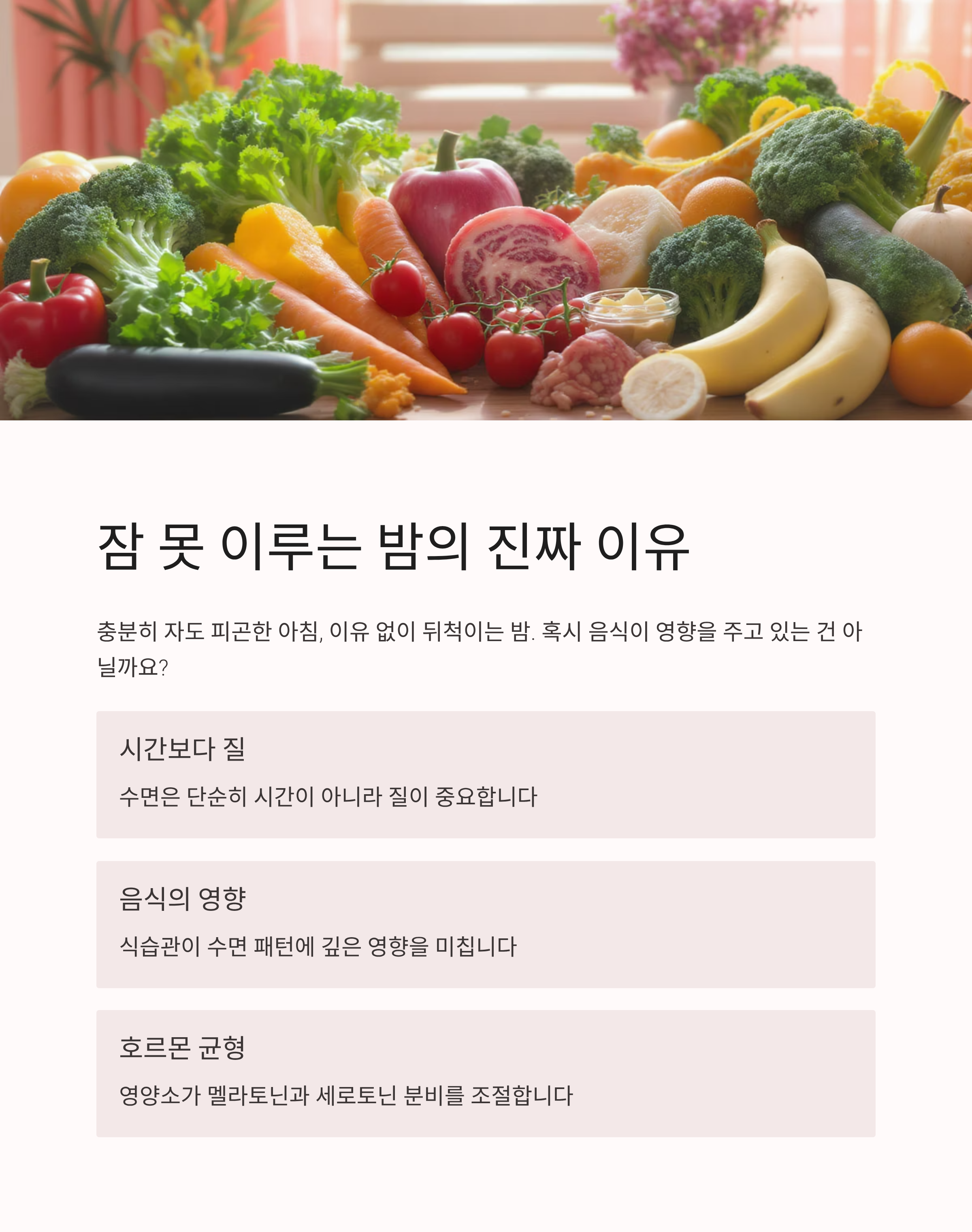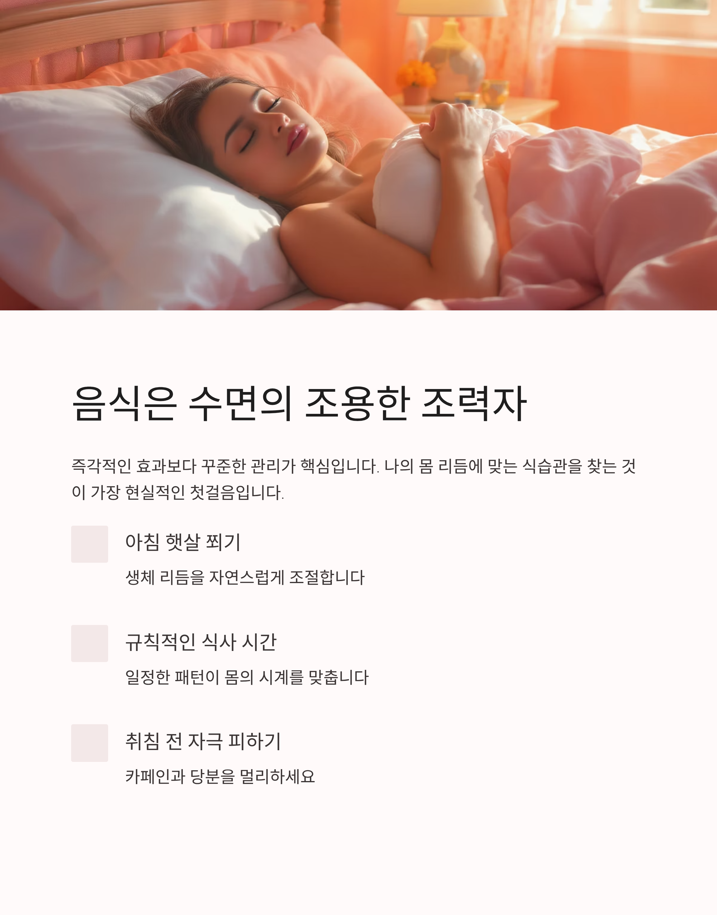 음식과 영양소는 마치 수면의 무대 뒤에서 조용히 역할을 하는 조연과 같습니다. 즉각적인 효과를 기대하기보다, 꾸준한 관리가 핵심입니다. 나의 몸 리듬에 맞는 식습관을 찾는 것이 가장 현실적인 첫걸음입니다.