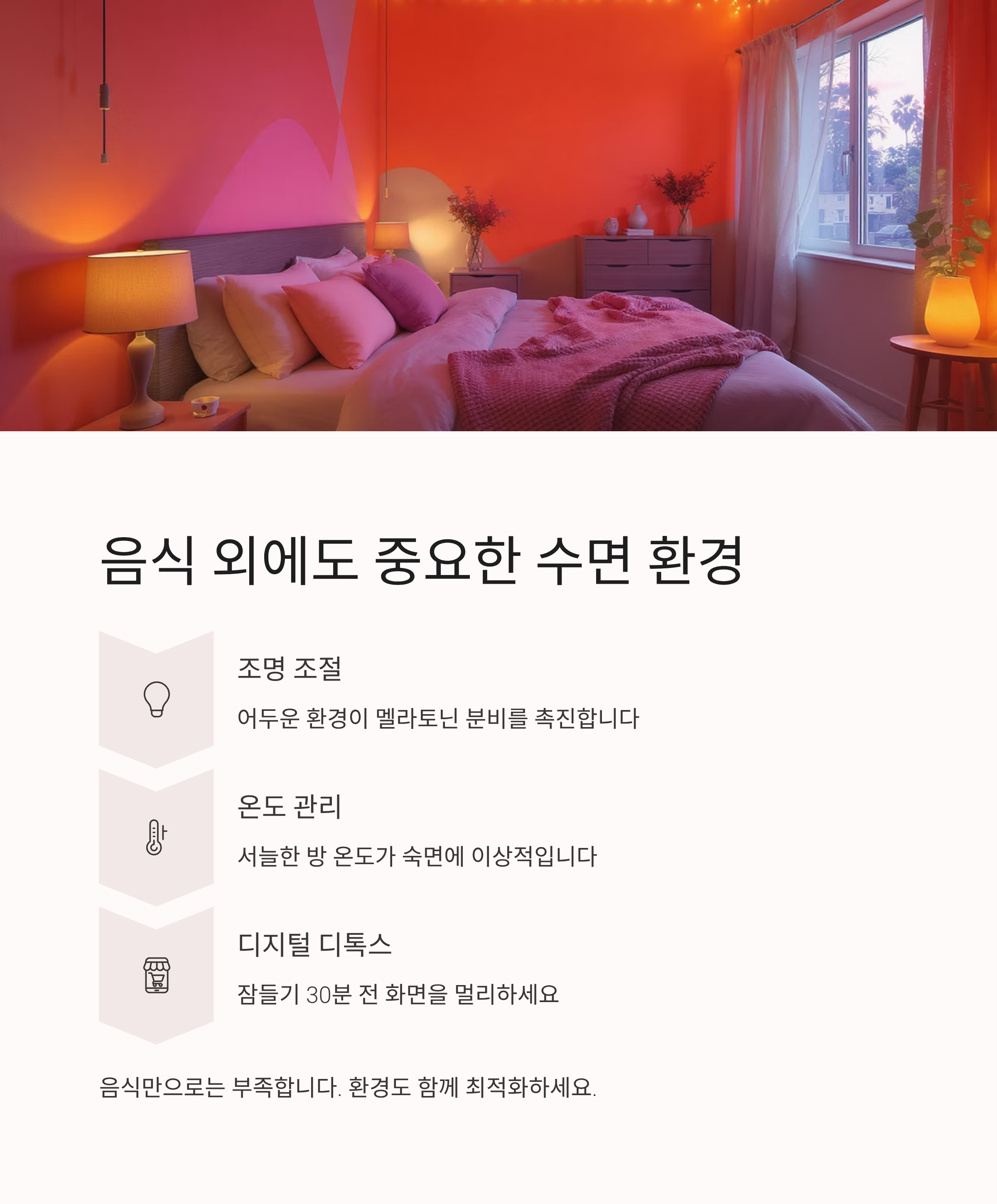 음식만으로 수면의 질을 완전히 바꾸기는 어렵습니다. 조명, 온도, 스마트폰 사용 습관도 큰 영향을 줍니다. 잠들기 전 최소 30분은 화면을 멀리하고, 방 온도를 서늘하게 유지하면 훨씬 숙면에 도움이 됩니다.