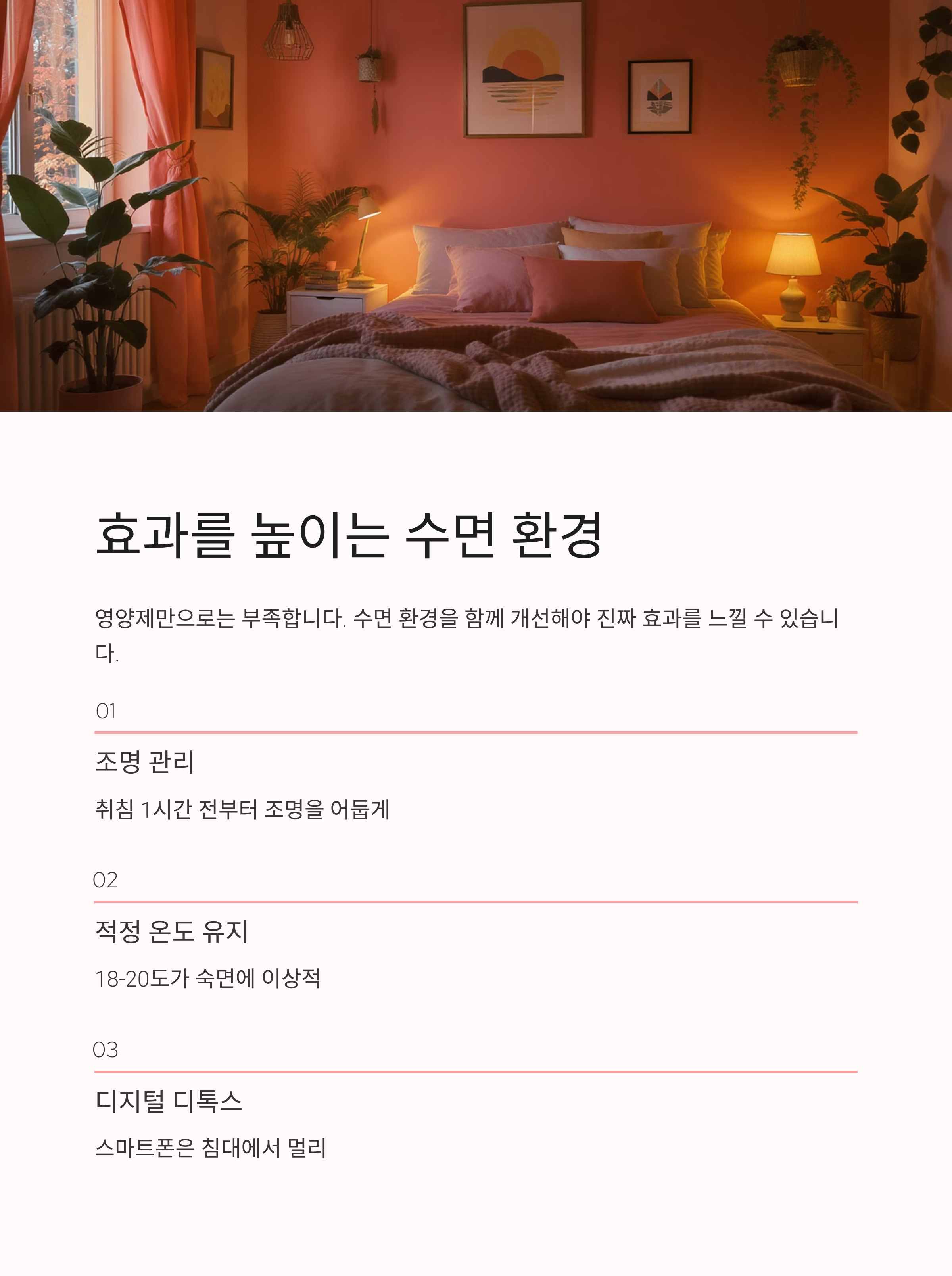 많은 후기에서 공통적으로 강조되는 한 가지가 있습니다. 바로 “수면 환경을 함께 개선해야 한다”는 점입니다. 조명, 온도, 스마트폰 사용 습관까지 함께 관리해야 영양제의 효과를 제대로 느낄 수 있습니다.