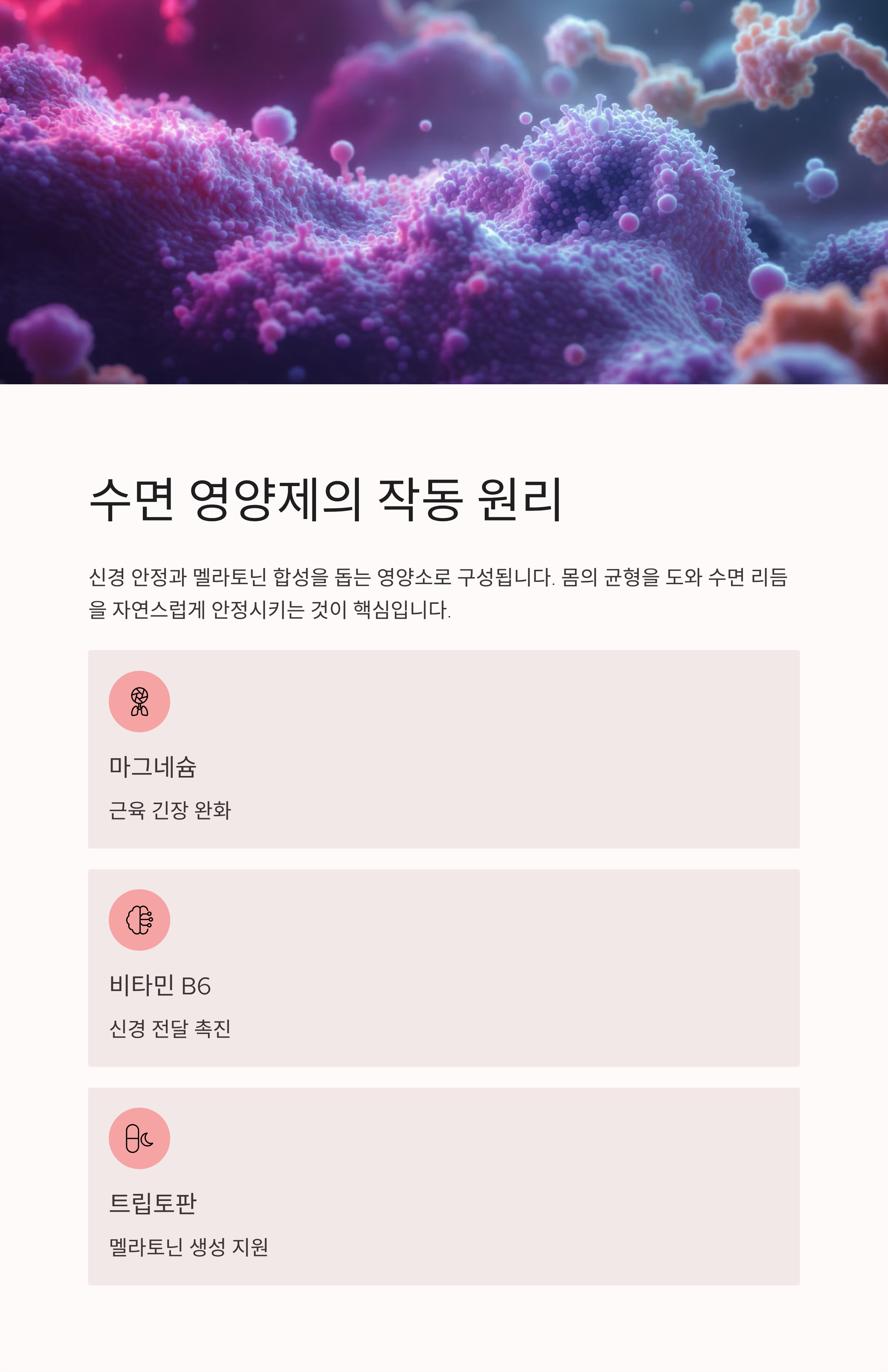 수면 영양제는 신경 안정과 멜라토닌 합성에 관여하는 영양소를 중심으로 구성됩니다. 예를 들어 마그네슘은 근육 긴장을 완화하고, 비타민 B6는 신경 전달을 돕습니다. 트립토판은 세로토닌과 멜라토닌 생성의 전단계 물질로 알려져 있습니다. 이처럼 몸의 균형을 도와 수면 리듬을 안정시키는 것이 핵심 원리입니다.