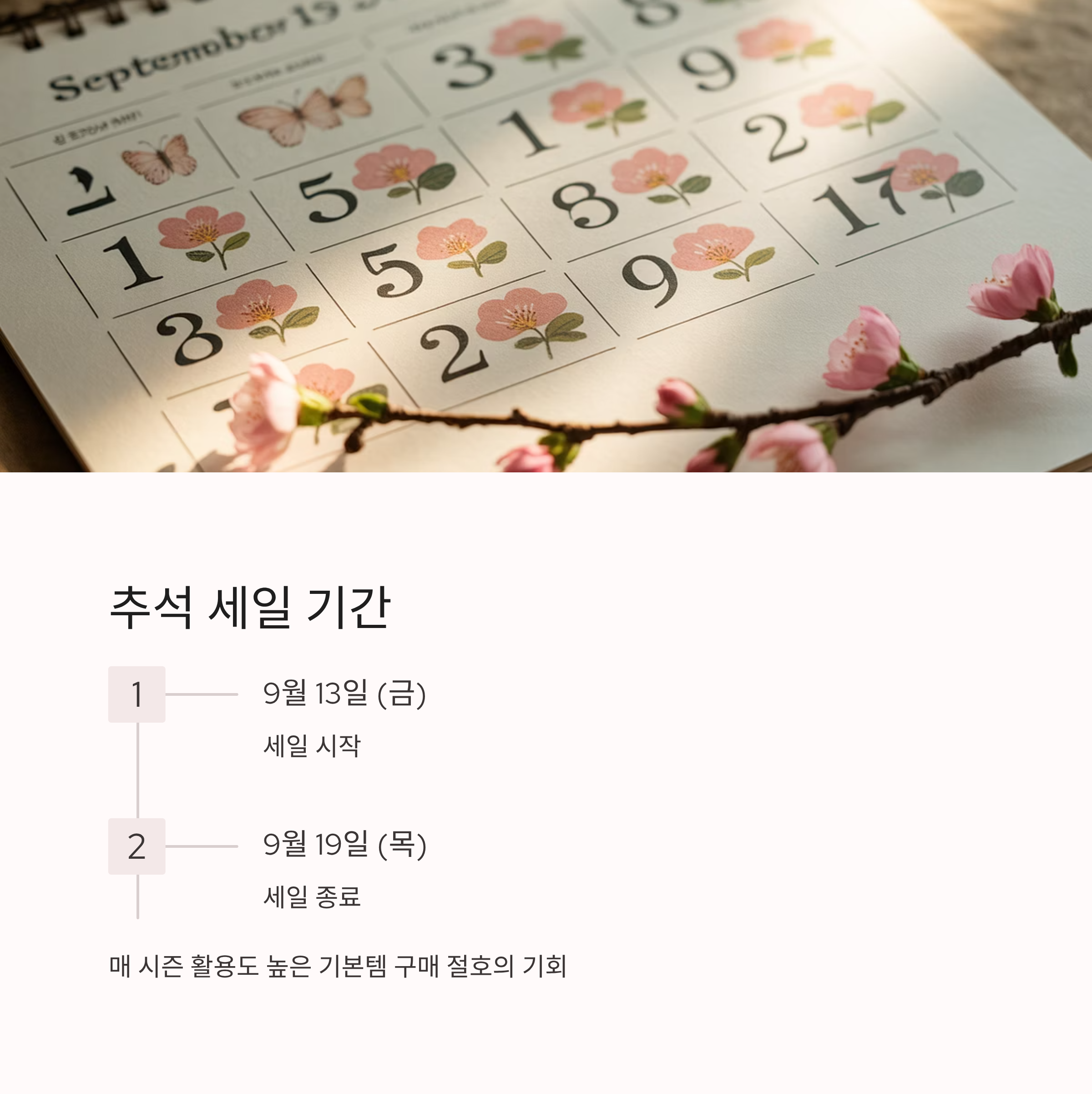 이번 세일은 2024년 9월 13일(금)부터 9월 19일(목)까지 일주일간 진행됩니다. 매 시즌 활용도가 높은 기본템들을 구매하기 딱 좋은 타이밍입니다.