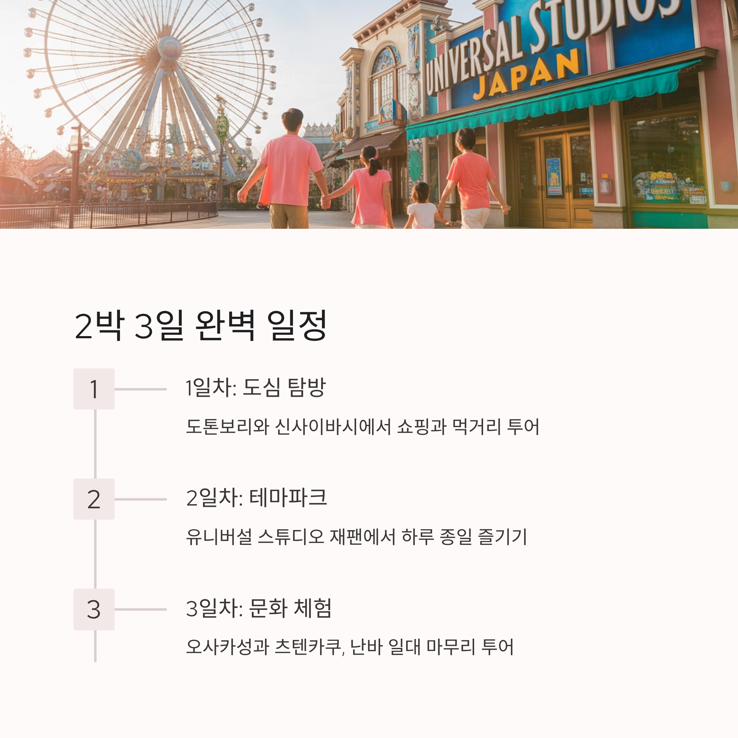 | 2박 3일 | 도톤보리, USJ, 오사카성 | 짧고 굵은 일정 |