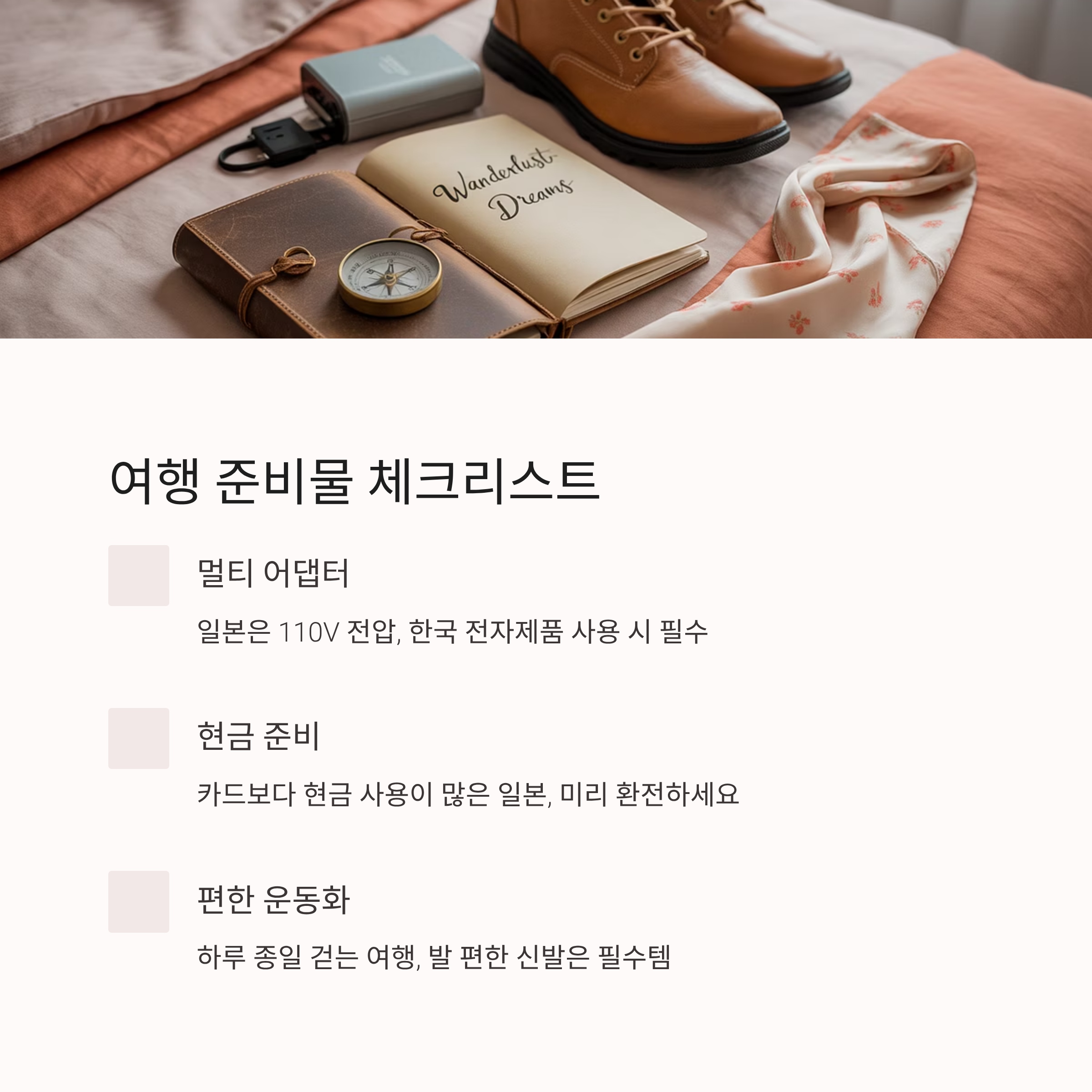 일본은 전압이 110V이므로 멀티 어댑터를 준비해야 하며, 현금도 일부 챙기는 것이 좋습니다. 또한 편한 운동화는 필수 아이템입니다.