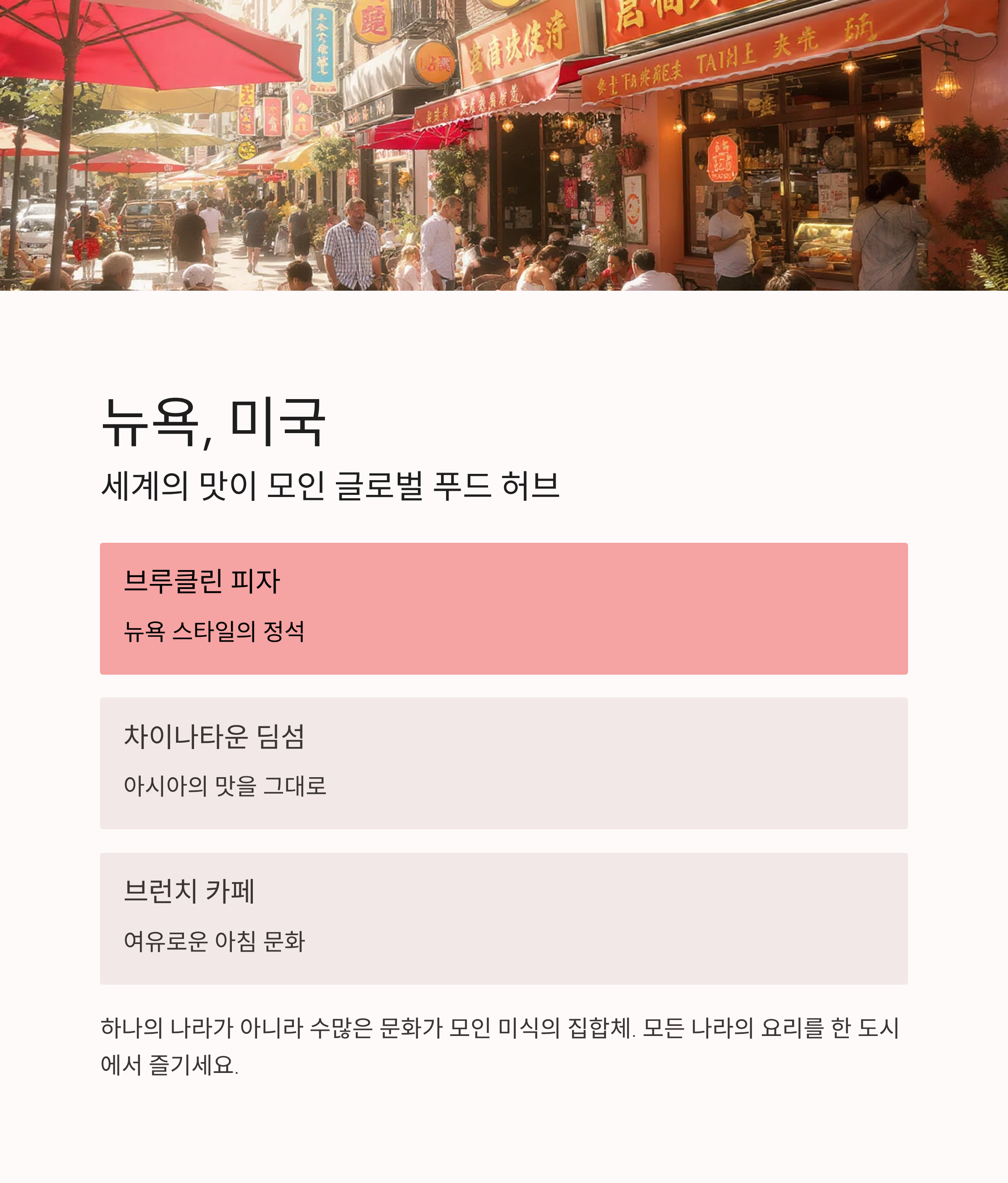 뉴욕은 하나의 나라가 아니라 수많은 문화가 모인 미식의 집합체입니다. 브루클린의 피자, 차이나타운의 딤섬, 브런치 카페까지. 모든 나라의 요리를 한 도시 안에서 즐길 수 있는 것이 바로 뉴욕의 매력입니다.