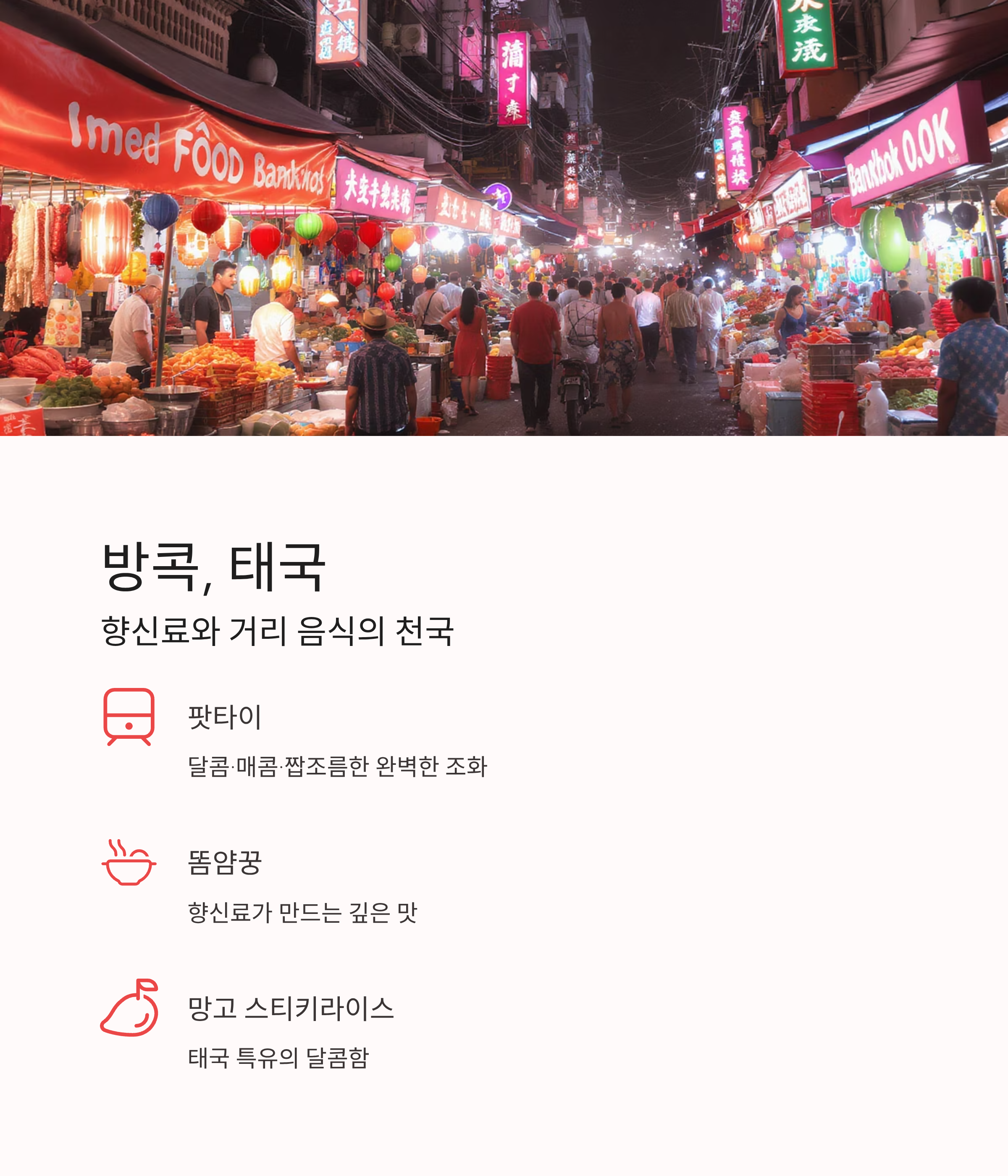 방콕의 길거리에서는 음식 냄새가 여행의 일부입니다. 팟타이, 똠얌꿍, 망고 스티키라이스까지 태국 특유의 달콤·매콤·짭조름한 맛이 완벽하게 어우러집니다. 미식가라면 반드시 도전해봐야 할 향신료의 도시입니다.