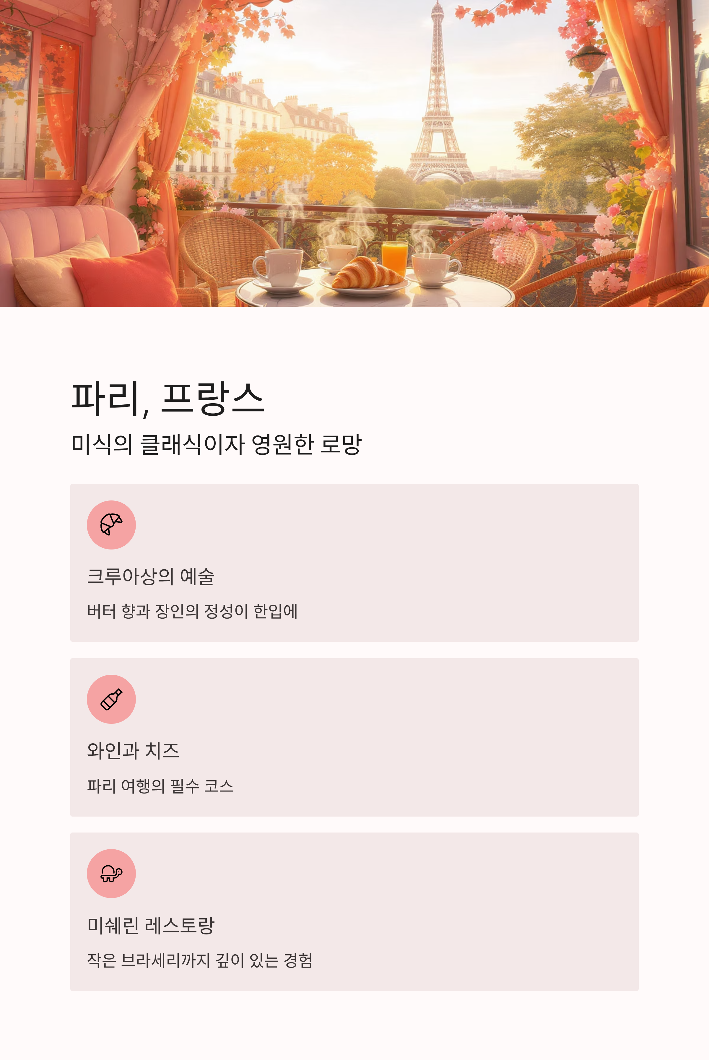 파리는 단순한 도시가 아니라 하나의 맛의 세계입니다. 크루아상 한입에서도 버터의 향과 장인의 정성이 느껴지죠. 미쉐린 레스토랑부터 작은 브라세리까지, 프랑스 요리의 깊이를 경험할 수 있습니다. 특히 와인과 치즈의 조화는 파리 여행의 필수 코스입니다.