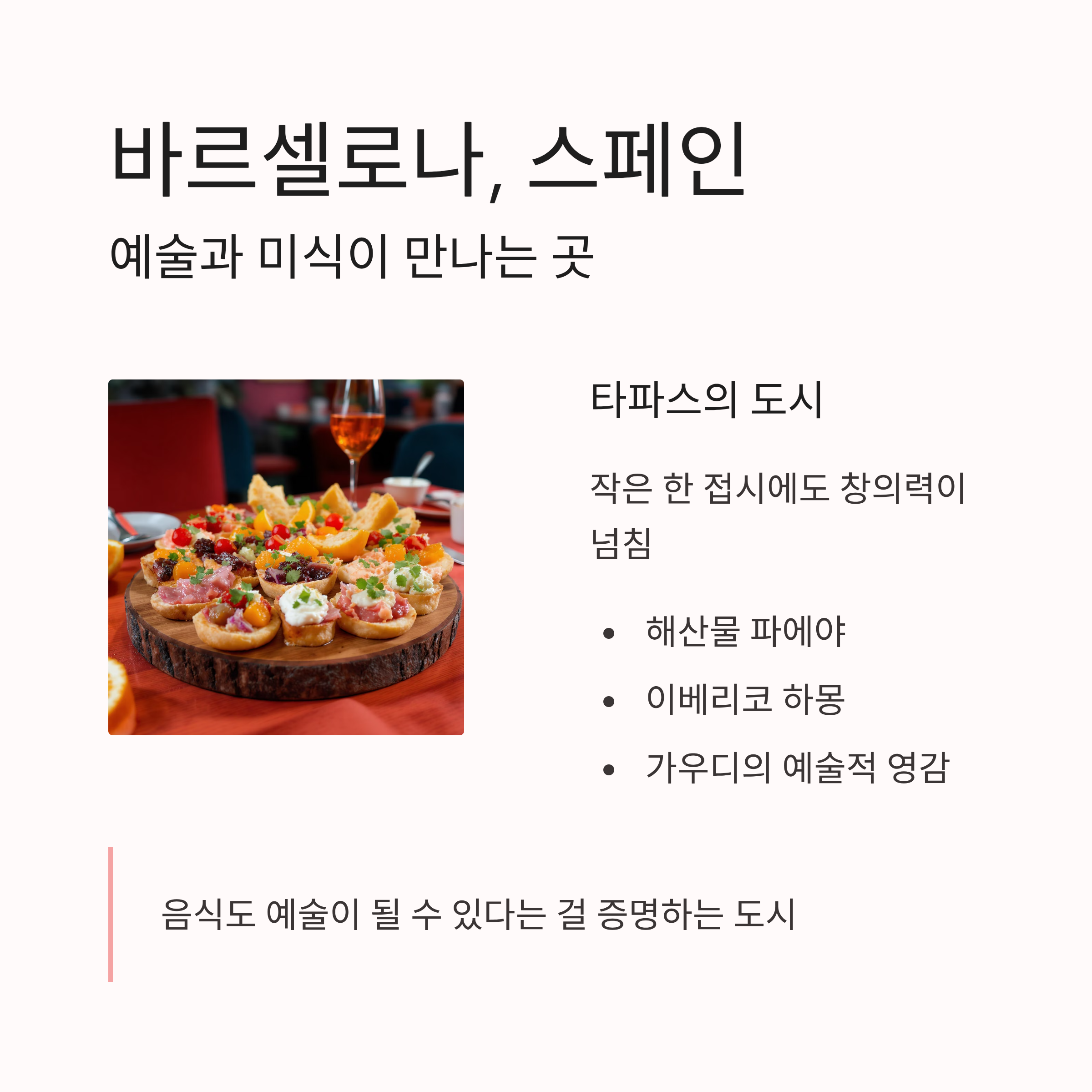 가우디의 도시이자 타파스의 도시. 바르셀로나에서는 작은 한 접시에도 창의력이 넘칩니다. 해산물 파에야와 이베리코 하몽은 여행자들이 꼭 맛보는 대표 메뉴이죠. 음식도 예술이 될 수 있다는 걸 증명하는 도시입니다.