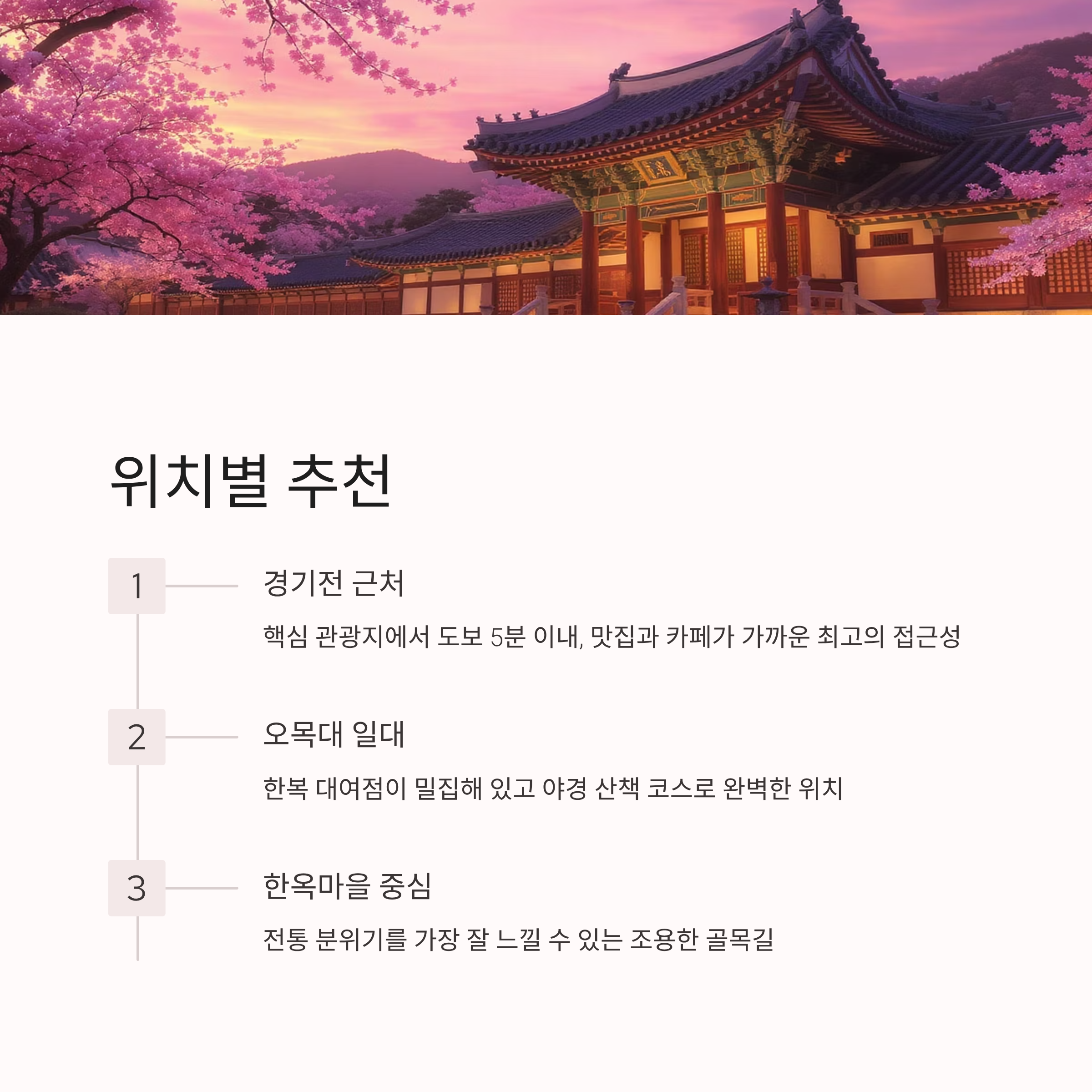 맛집, 카페, 한복 대여점이 가까워 이동이 편하고, 야경 산책 코스로도 완벽한 위치입니다.