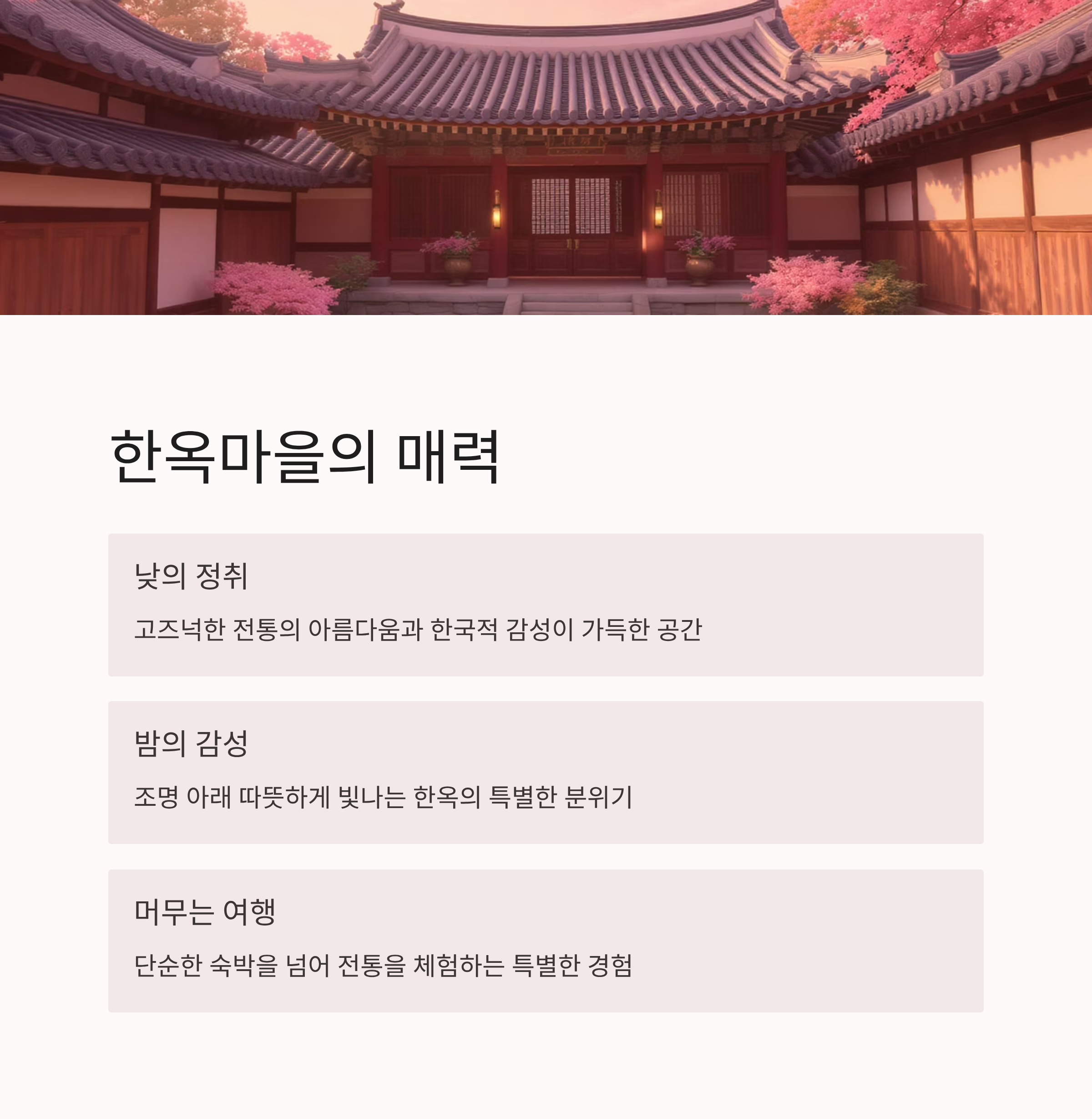기와지붕 아래서 들리는 바람 소리, 나무 마루의 온기, 그리고 전통이 깃든 공간의 여유로움까지.