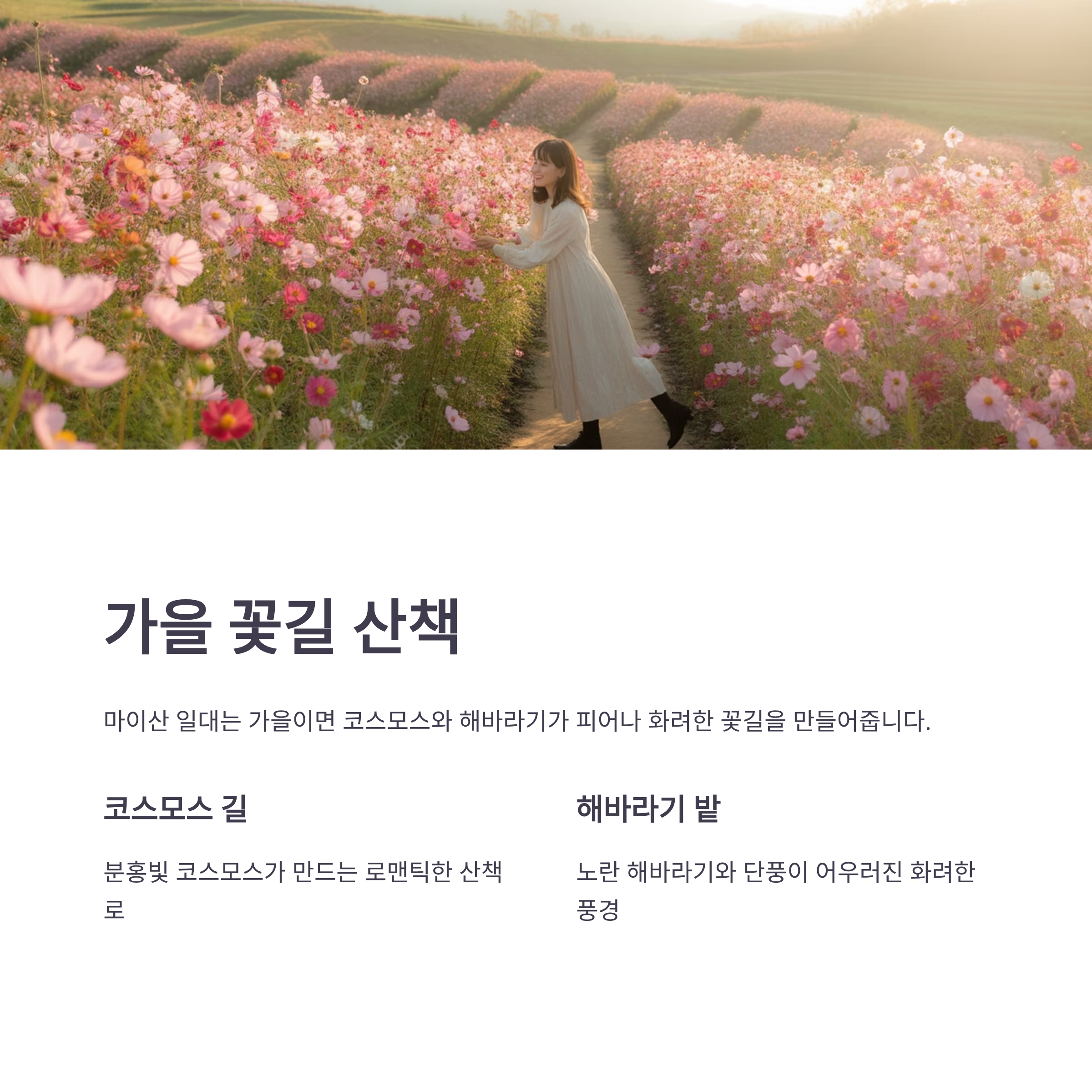 마이산 일대는 가을이면 코스모스와 해바라기 같은 계절 꽃이 피어나 화려한 길을 만들어줍니다. 가볍게 산책하며 꽃과 단풍을 함께 즐길 수 있습니다.