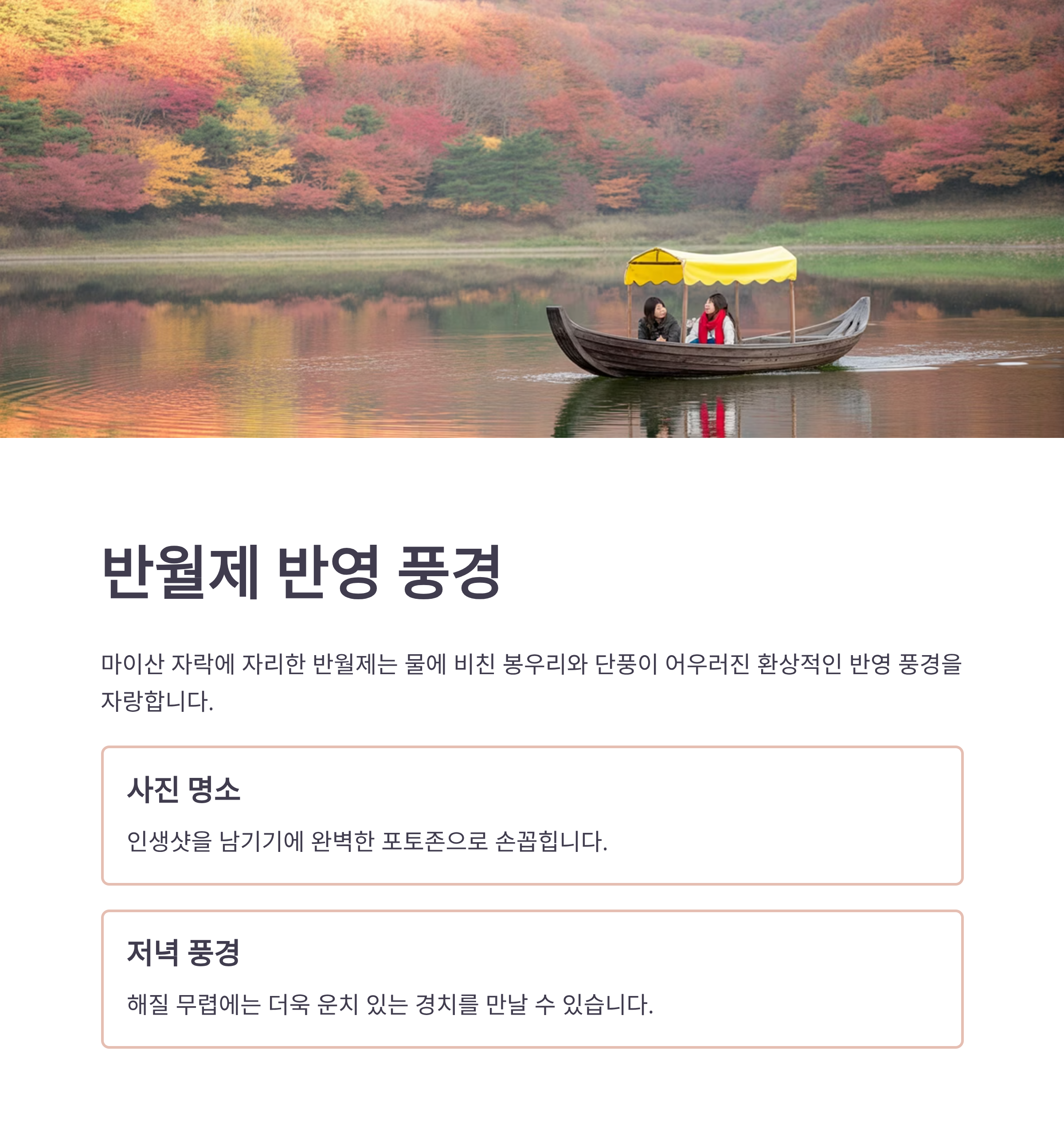 진안 마이산과 반월제는 가을의 정취를 고스란히 느낄 수 있는 여행지입니다. 가족, 연인, 친구와 함께 방문해 아름다운 자연과 여유로운 시간을 즐겨보시길 추천드립니다.