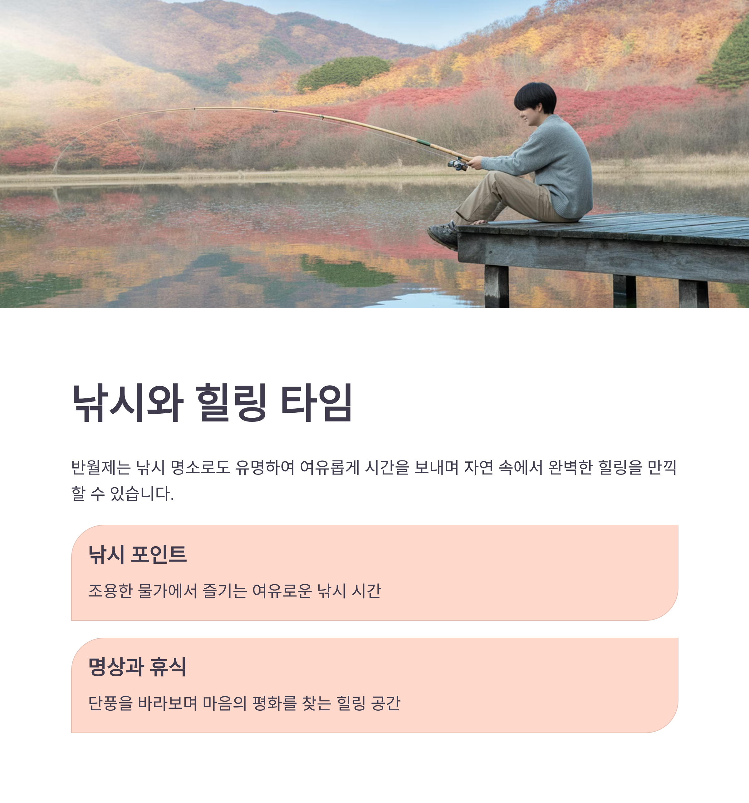 반월제는 낚시 명소로도 알려져 있어 여유롭게 시간을 보내기에 좋습니다. 단풍철에 방문하면 자연 속에서 힐링을 만끽할 수 있습니다.
