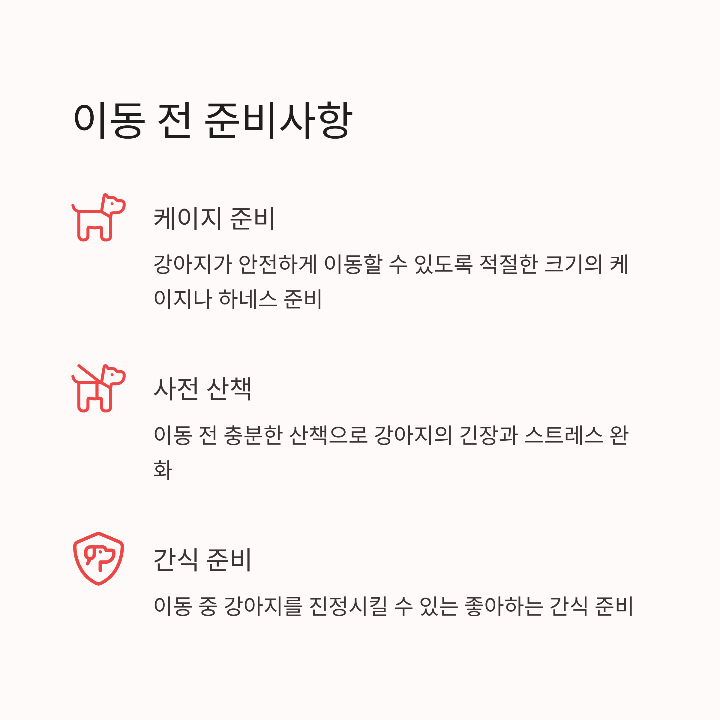 강아지가 낯선 공간에서 불안해할 수 있기 때문에 사전에 케이지나 하네스를 준비하는 것이 좋습니다. 또한 이동 전 산책을 시켜 긴장을 줄여주는 것도 도움이 됩니다.