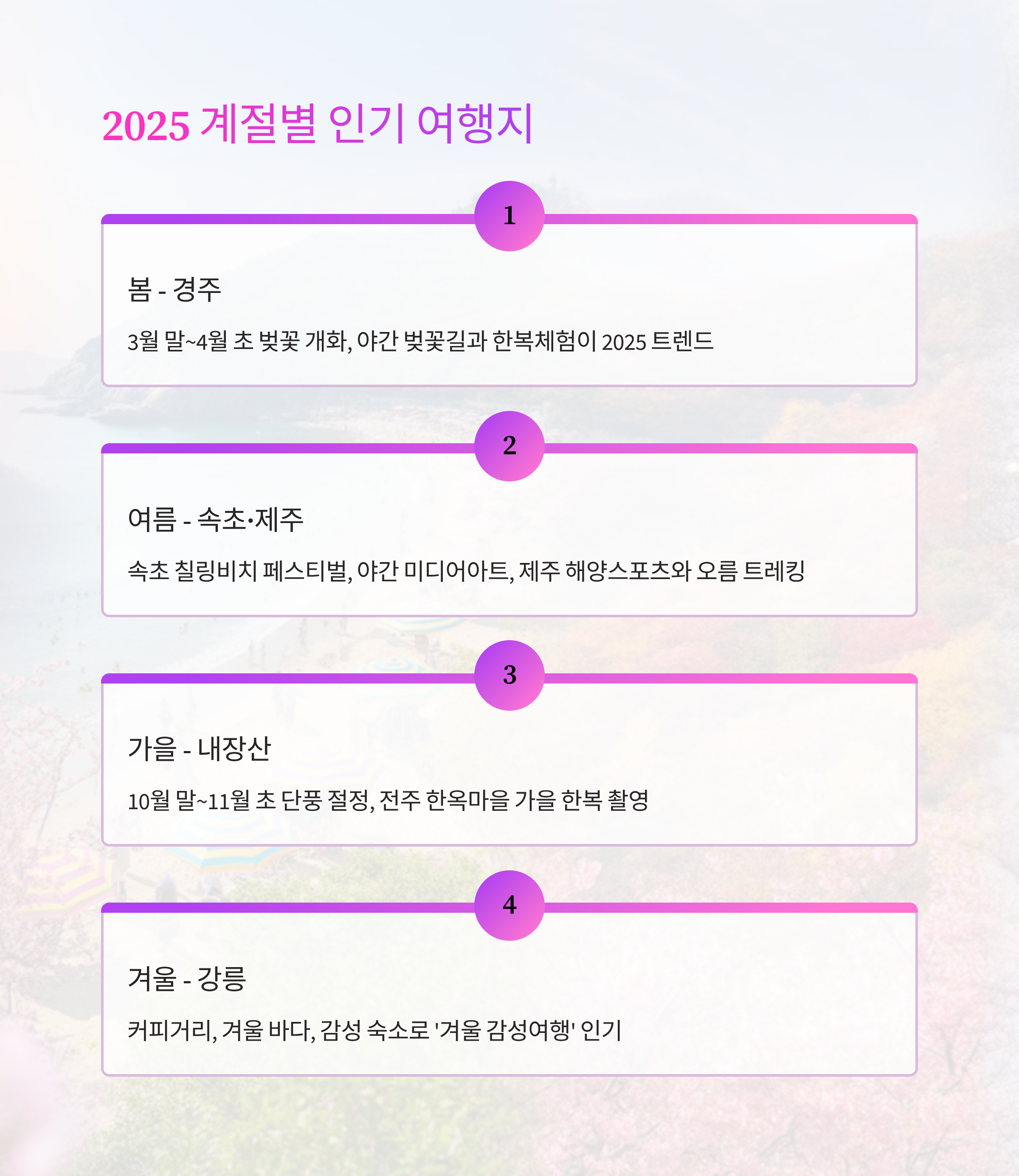 사계절 테마별로 추천하는 여행지와 꿀팁까지 한 번에 확인하세요.