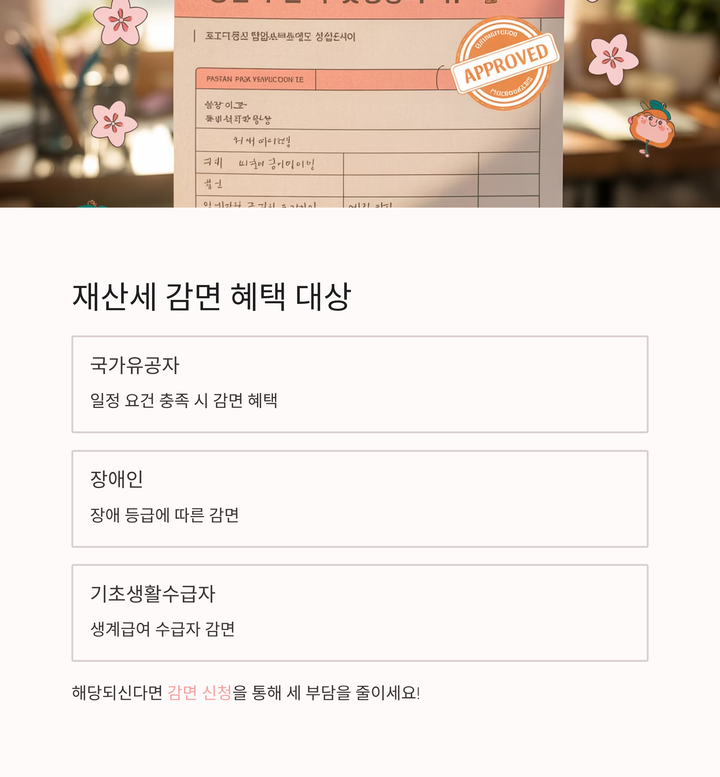 일정 요건에 해당되는 경우 재산세 감면 혜택을 받을 수도 있습니다. 예를 들어 국가유공자, 장애인, 기초생활수급자 등에 해당된다면 감면 신청을 통해 세 부담을 줄일 수 있습니다.