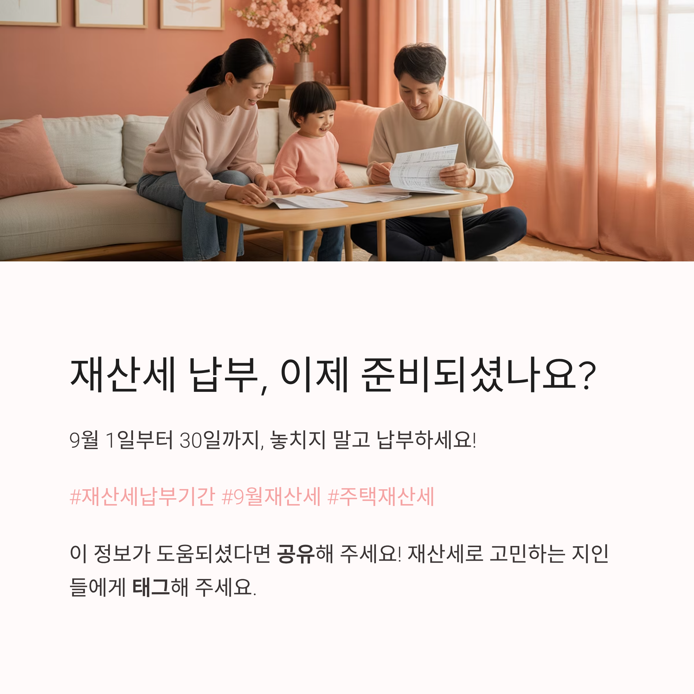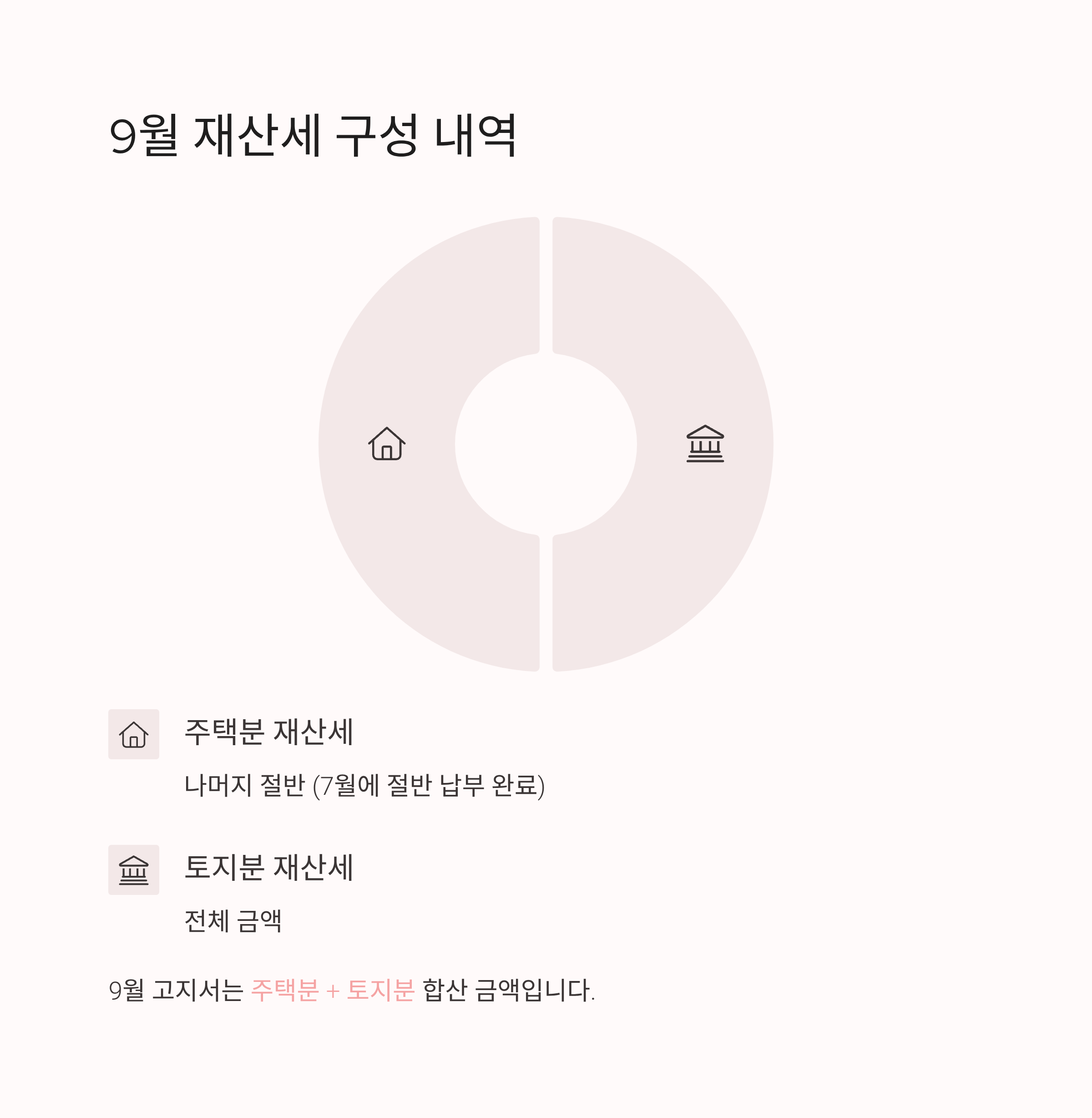 9월에는 주택분 재산세의 나머지 절반과 토지분 재산세가 함께 부과됩니다. 이미 7월에 주택분 절반을 납부했다면 이번 9월 고지서는 나머지 주택분과 토지분을 합산한 금액으로 확인할 수 있습니다.