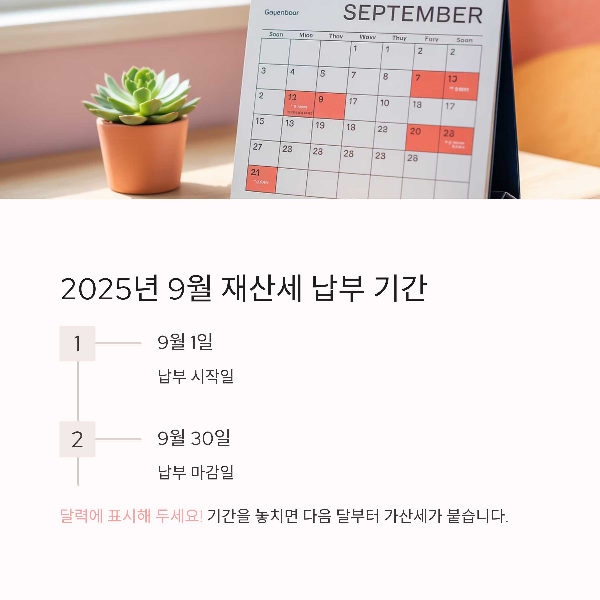 2025년 9월 재산세는 9월 1일부터 9월 30일까지 납부 가능합니다. 이 기간을 놓치면 다음 달부터 가산세가 붙기 때문에 반드시 달력에 표시해 두는 것이 좋습니다.