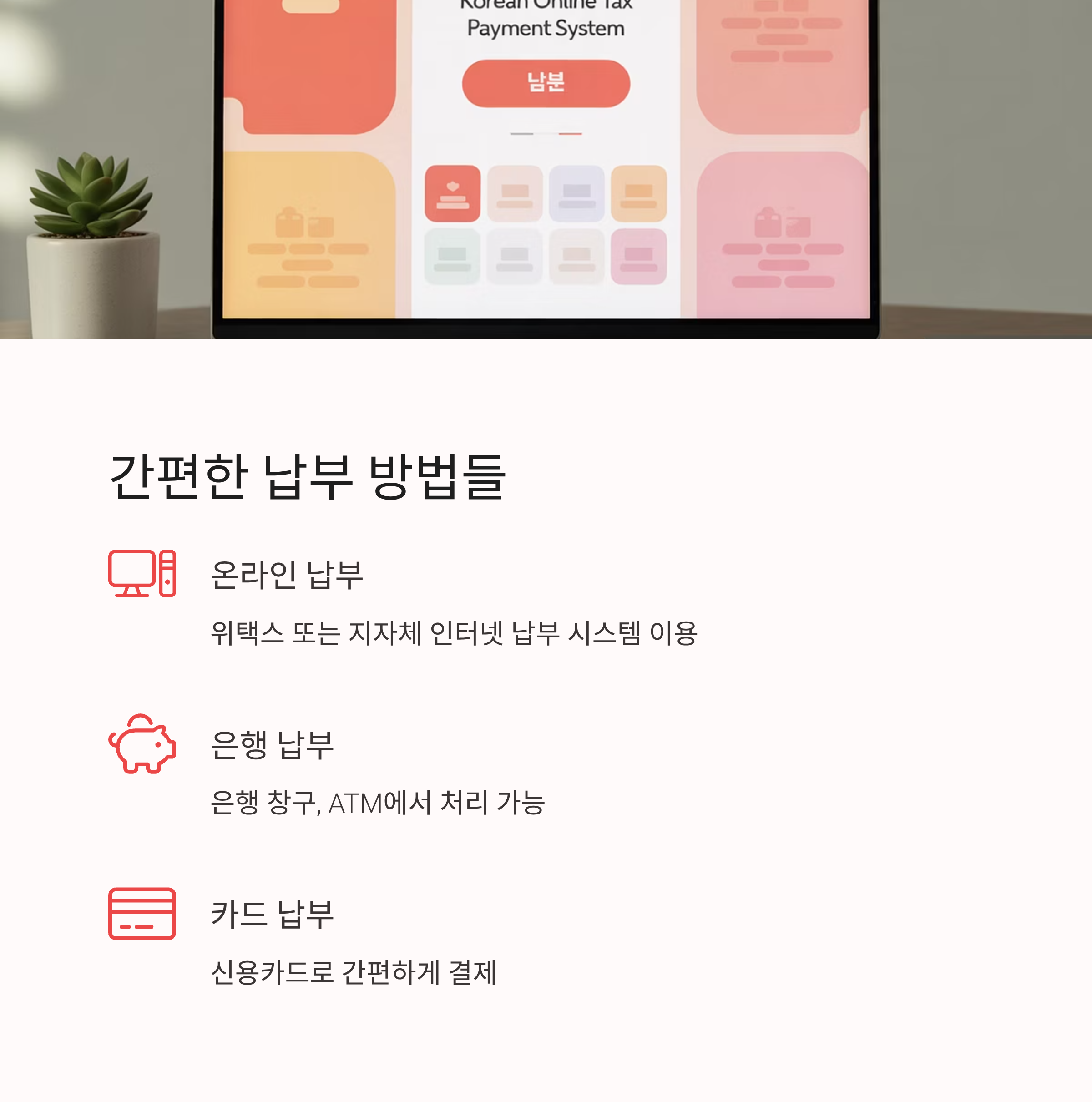 가장 간단한 방법은 위택스 또는 지자체 인터넷 납부 시스템을 이용하는 것입니다. 은행 창구, ATM, 카드 납부도 가능하며, 납부 기한 내 어디서든 처리할 수 있습니다.