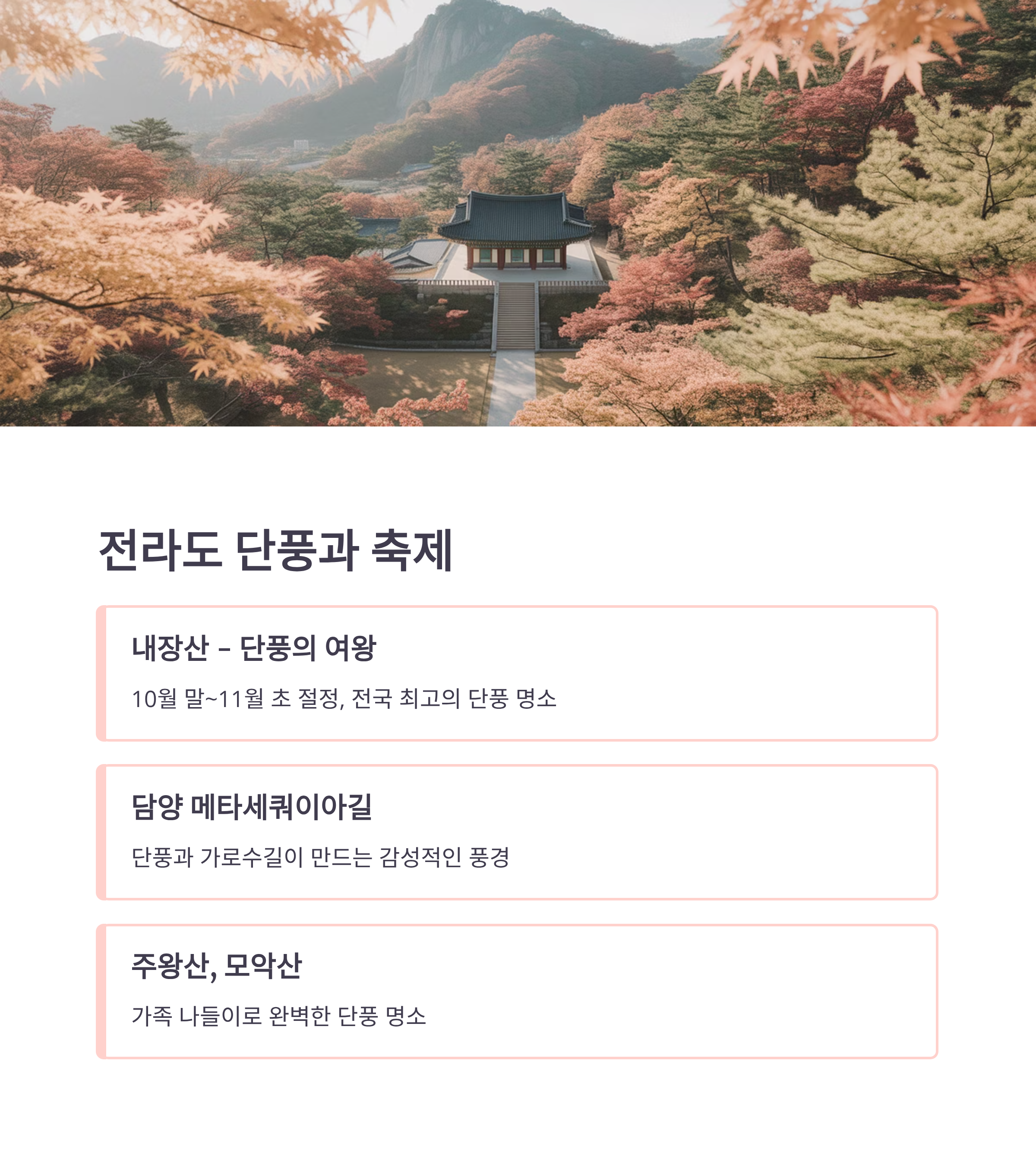 전라도는 단풍뿐 아니라 지역 축제와 함께 즐길 수 있어 매력이 배가됩니다.