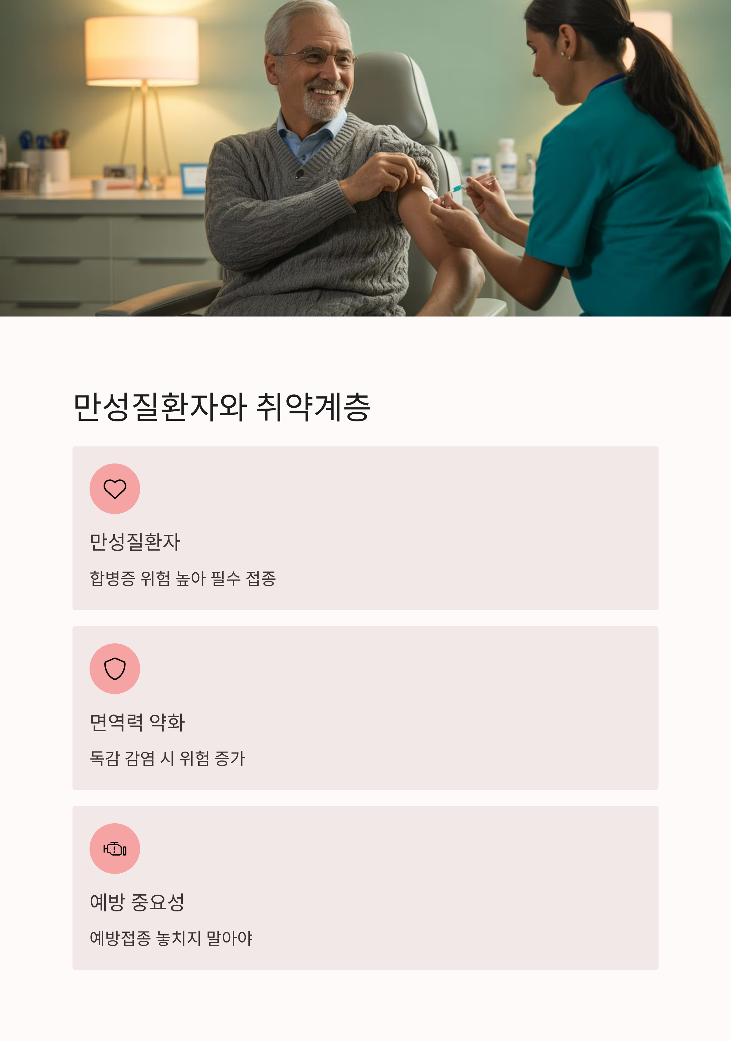 만성질환이 있는 분들이나 면역력이 약한 분들은 독감에 걸릴 경우 합병증 위험이 높습니다. 따라서 예방접종을 놓치지 않는 것이 중요합니다.