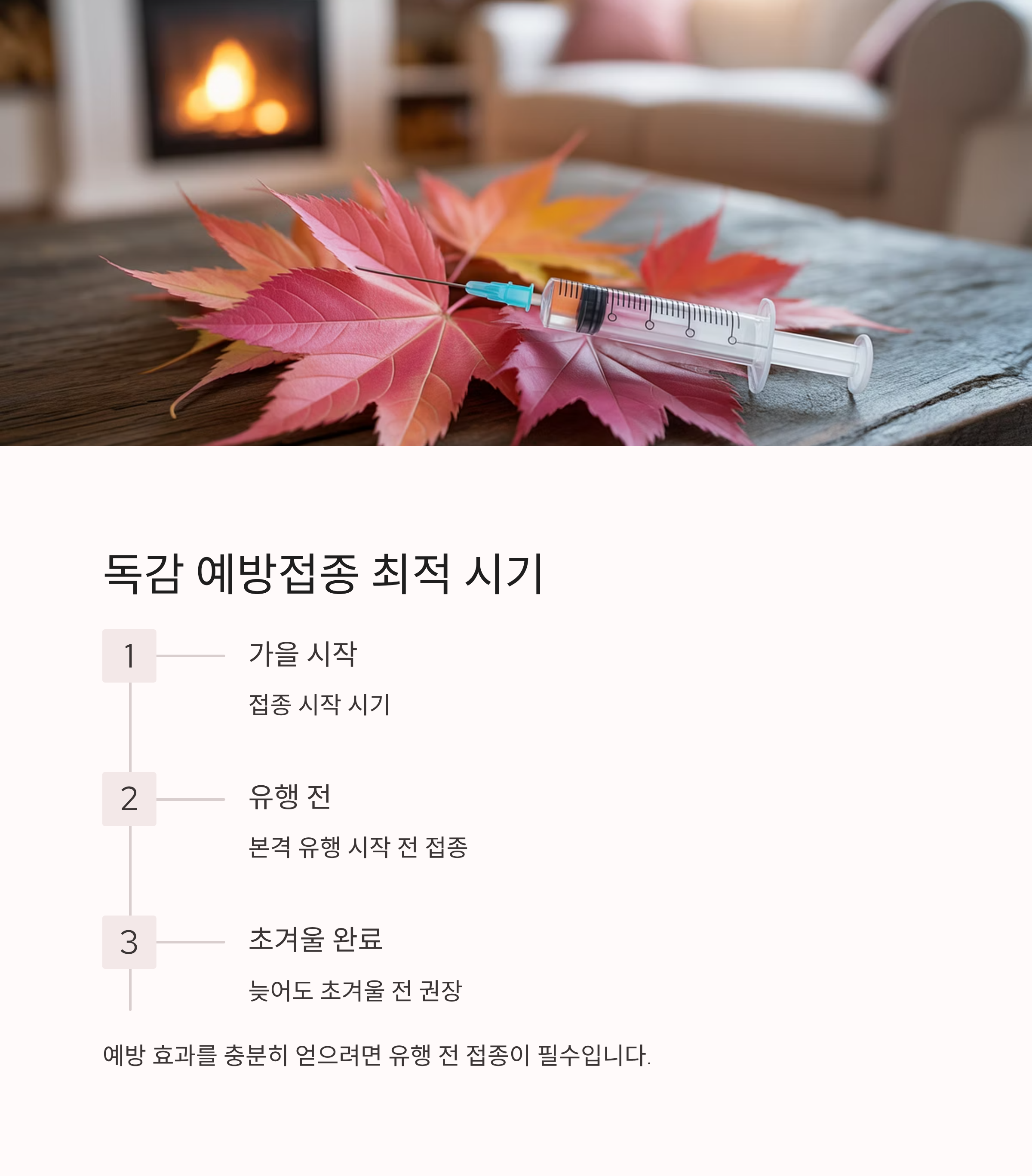 예방 효과를 충분히 얻기 위해서는 유행이 본격적으로 시작되기 전에 접종하는 것이 좋습니다. 보통 가을부터 접종이 시작되며, 늦어도 초겨울 전에는 마치는 것이 권장됩니다.