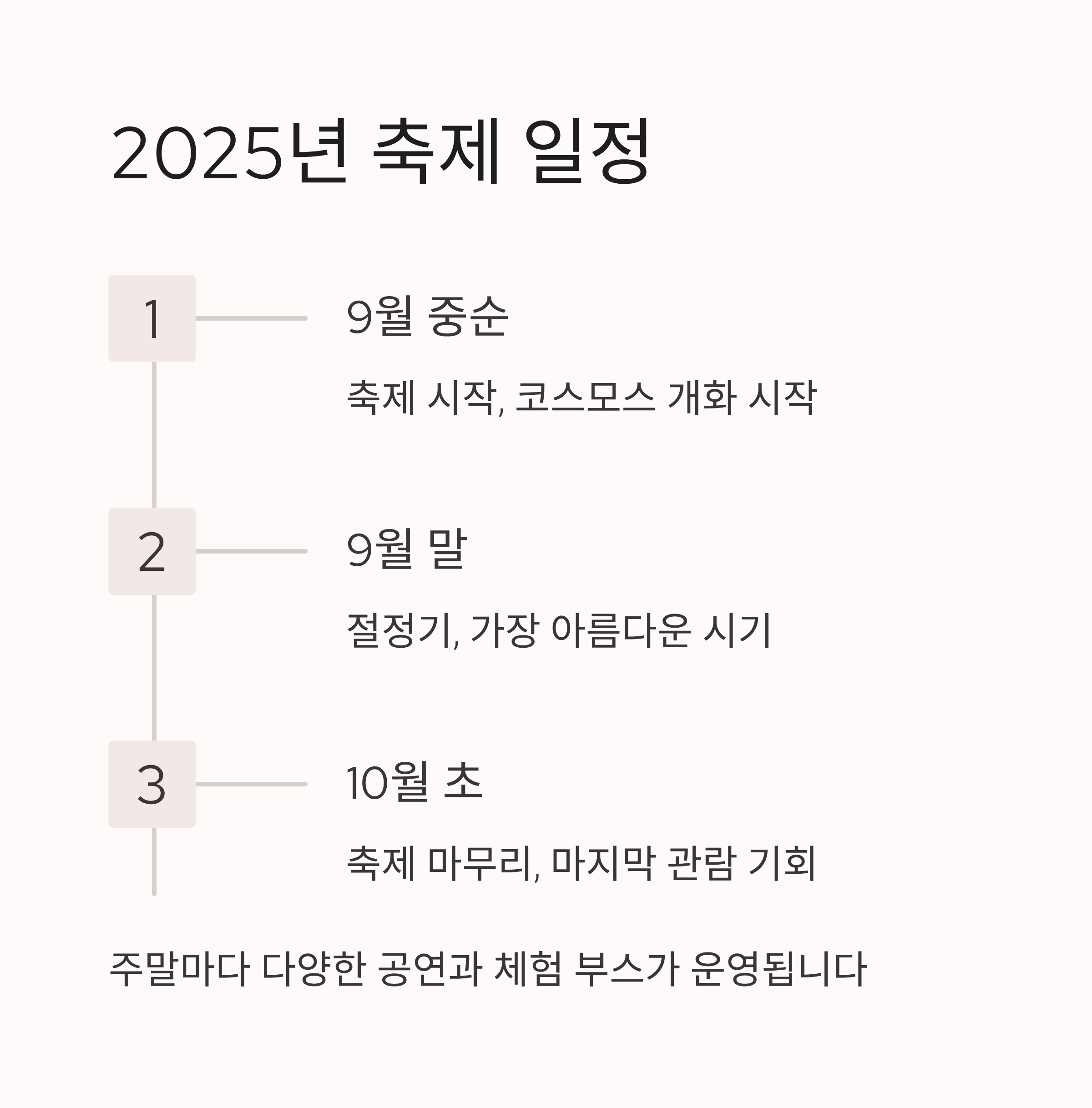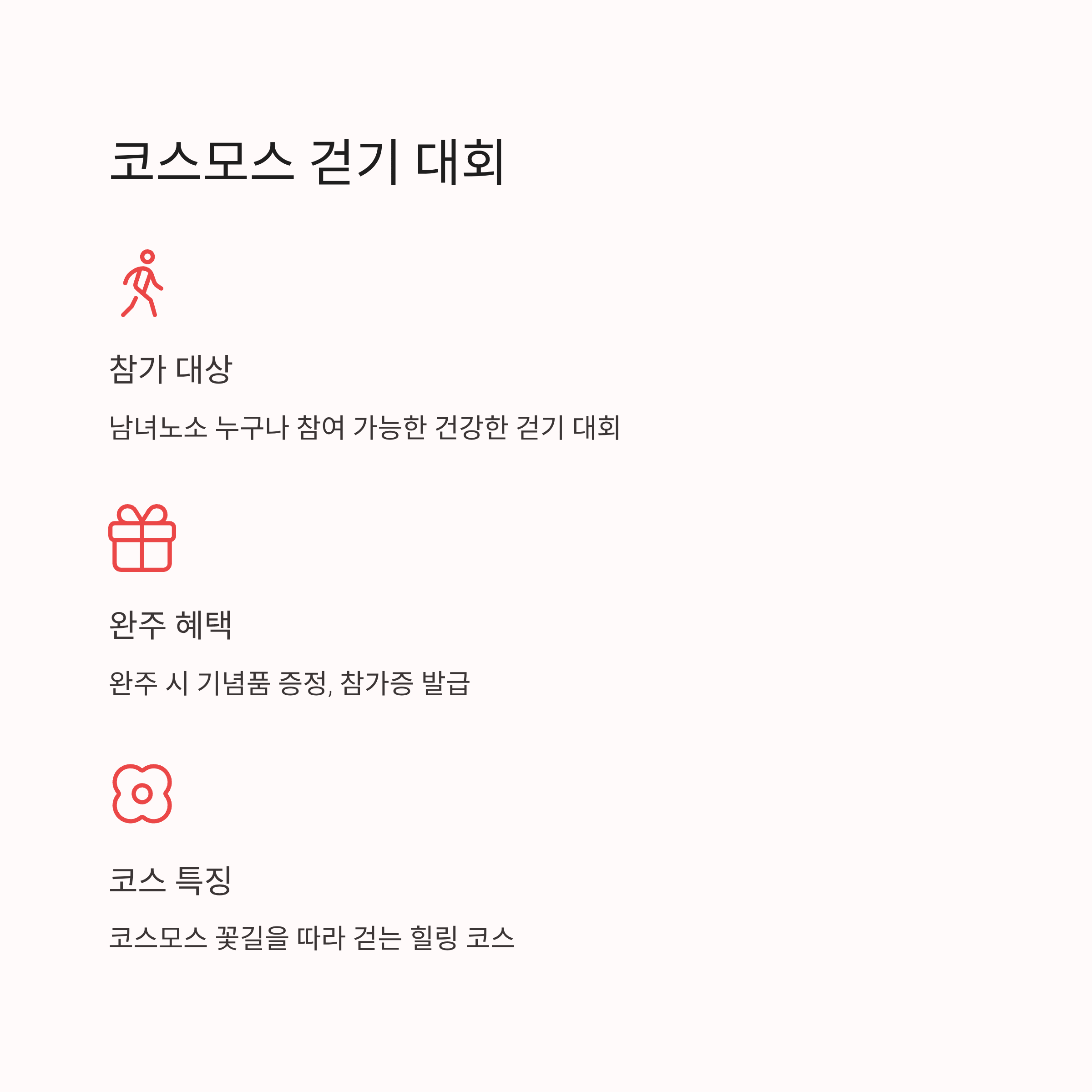 | 주요 행사 | 코스모스 걷기 대회, 공연, 체험 부스 |
