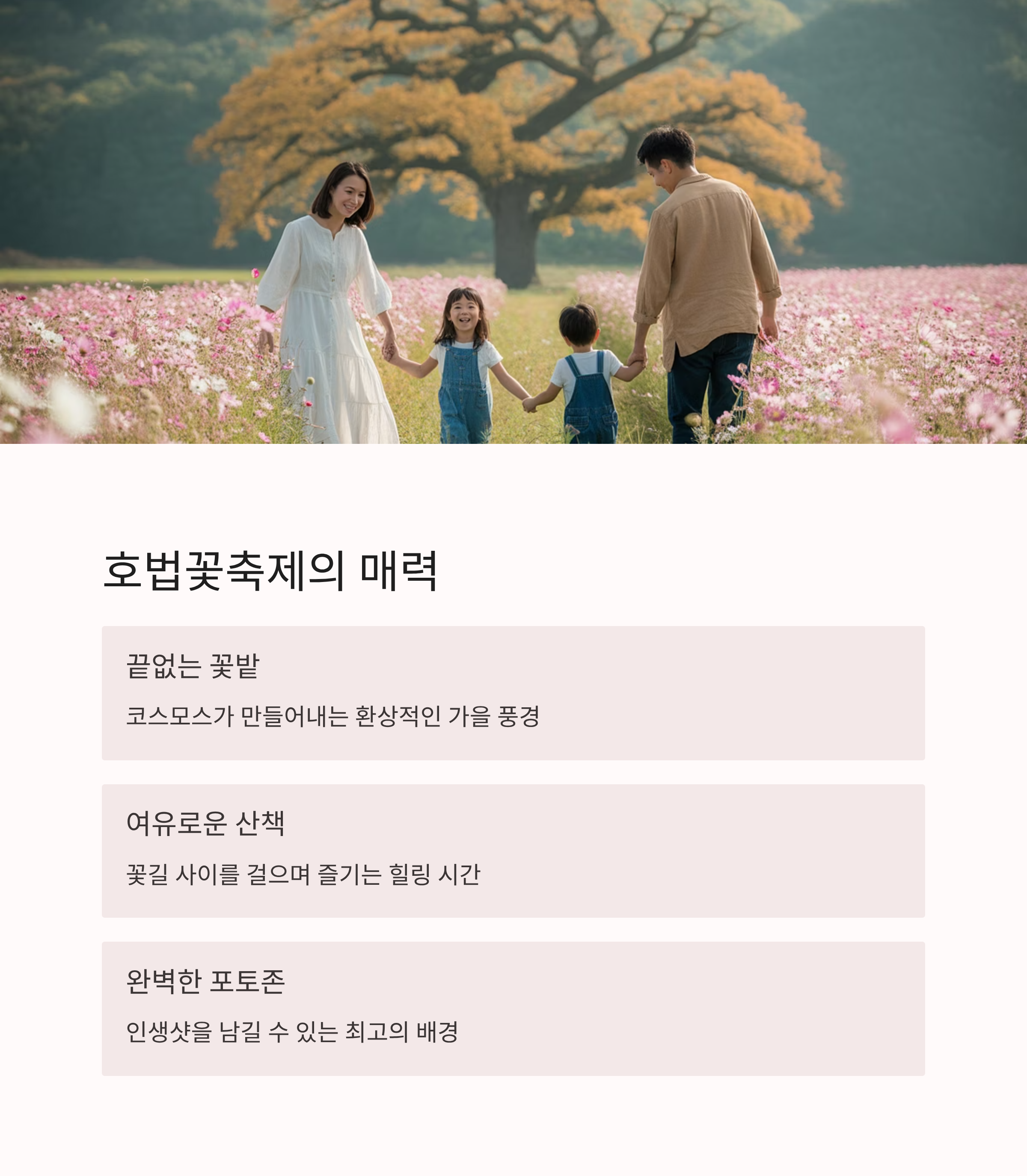 가을이 되면 이천은 코스모스 꽃길로 물들며 호법꽃축제가 열립니다. 가족 단위 나들이객부터 사진을 좋아하는 여행객까지 모두가 즐길 수 있는 축제인데요. 이번 글에서는 2025 호법꽃축제 주요 일정과 즐길 거리, 그리고 걷기 대회 코스를 한눈에 정리해 드리겠습니다.