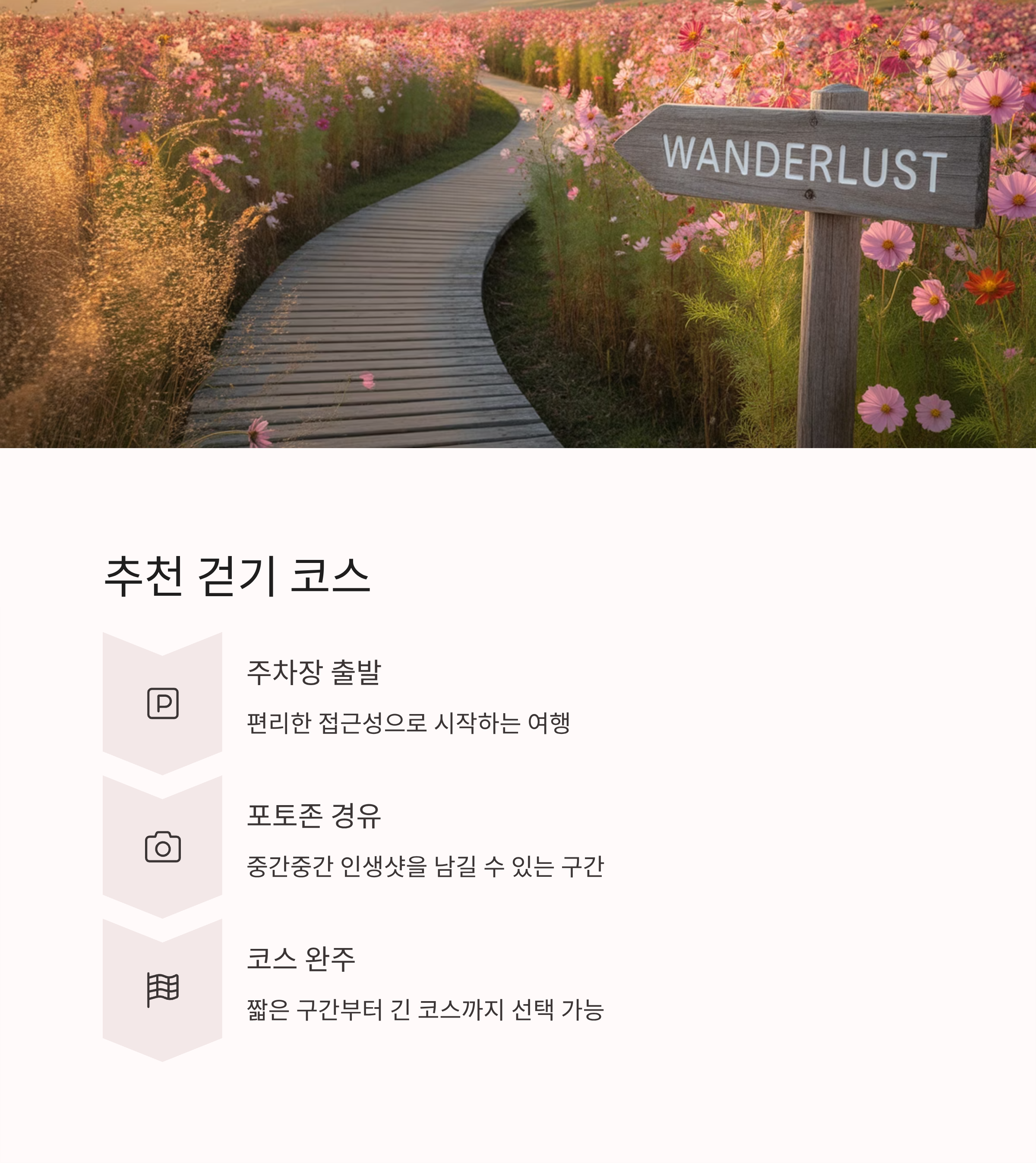 주차장 인근에서 출발해 코스모스 꽃길을 따라 걸으며 중간중간 포토존에서 사진을 남길 수 있습니다. 아이들과 함께라면 짧은 구간을, 체력에 자신 있다면 긴 코스를 선택하는 것도 좋습니다.