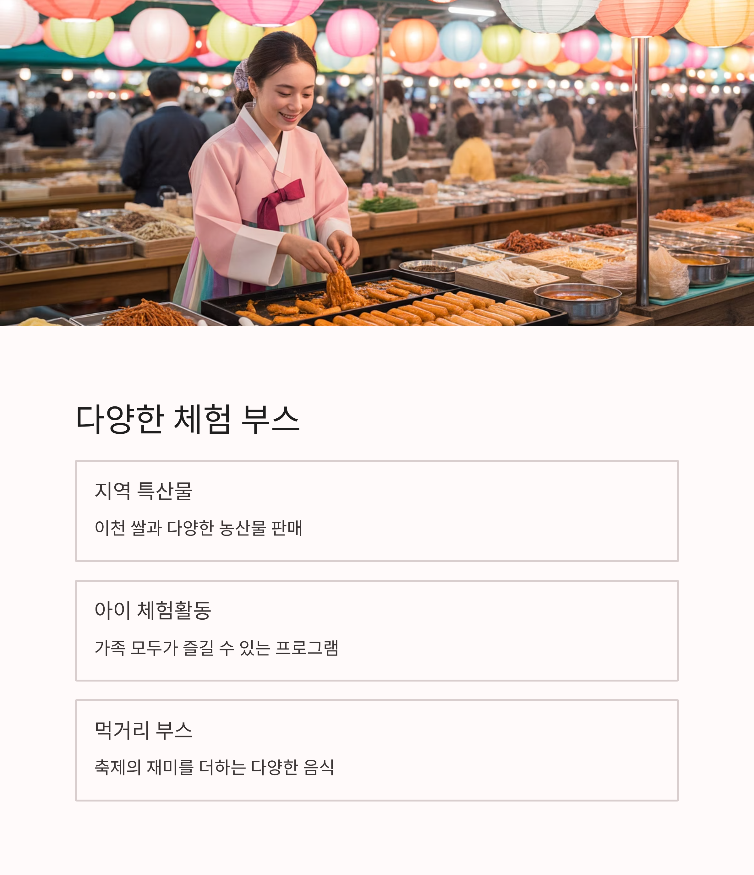 현장에는 지역 특산물 판매 부스와 아이들을 위한 체험 활동이 준비되어 있습니다. 먹거리와 즐길 거리가 다양해 축제의 재미를 더합니다.